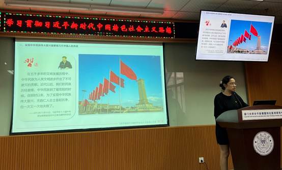 研究生第四党支部书记梁媛媛作“为什么习近平新时代中国特色社会主义思想是党和国家必须长期坚持的指导思想”主题党课分享。从习近平新时代中国特色社会主义思想的形成讲起,指出习近平新时代中国特色社会主义思想,是在中国特色社会主义进入新时代、科学社会主义迈向新阶段、当今世界经历新变局、我们党面临执政新考验的历史条件下形成和发展起来的。其核心要义是坚持和发展中国特色社会主义,是新时代中国共产党人的思想旗帜,国家政治生活和社会生活的根本指针,为发展马克思主义作出了中国的原创性贡献,谱写了马克思主义新篇章。