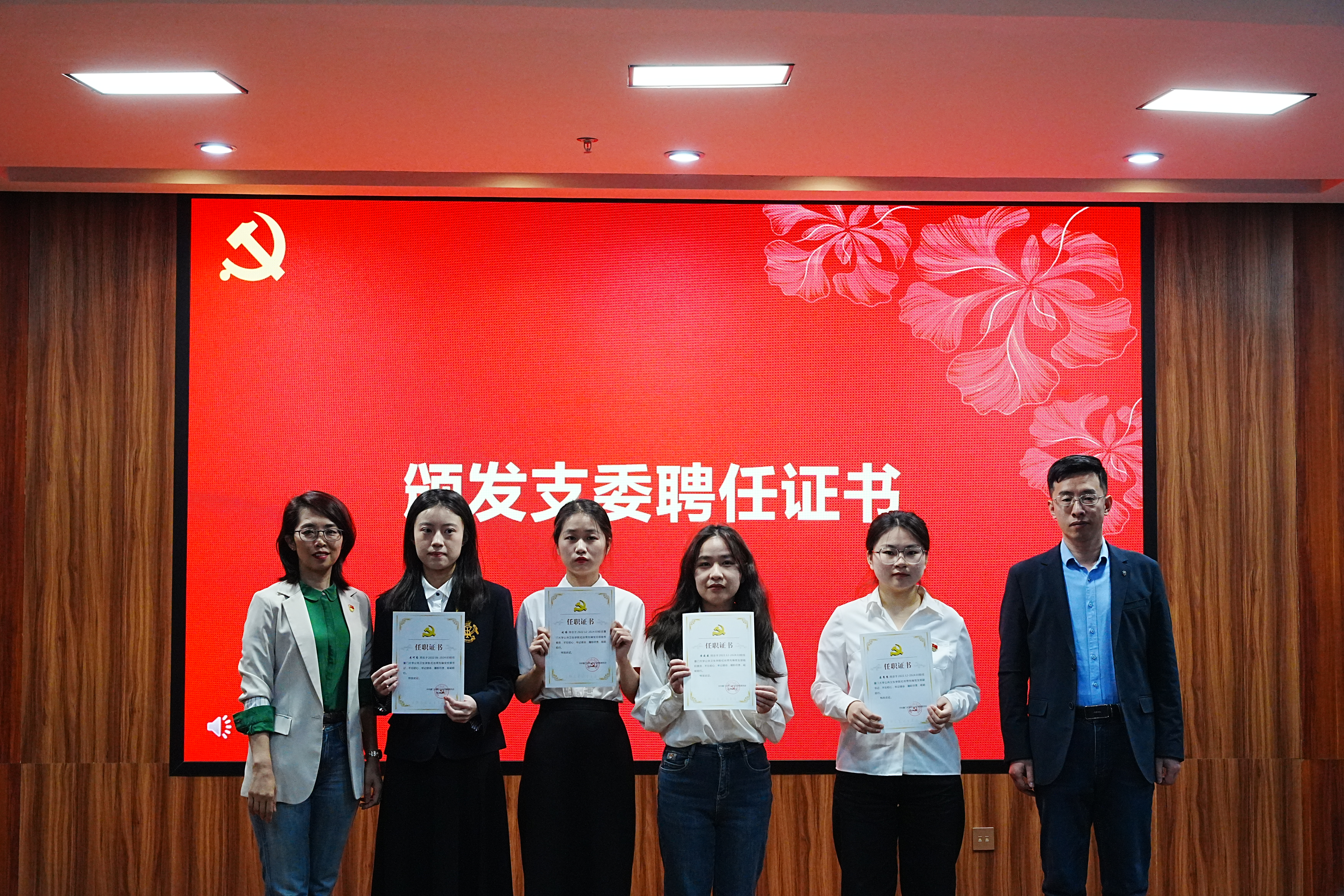 随后,由学院党委副书记庄曦、蒲晓业为红丝带先锋党支部2023年度支委颁发聘任证书,学院党委书记张琥为青春健康先锋党支部(学生中心党支部)授旗。最后,学院党委领导与青春健康先锋党支部(学生中心党支部)新任支委合影留念。