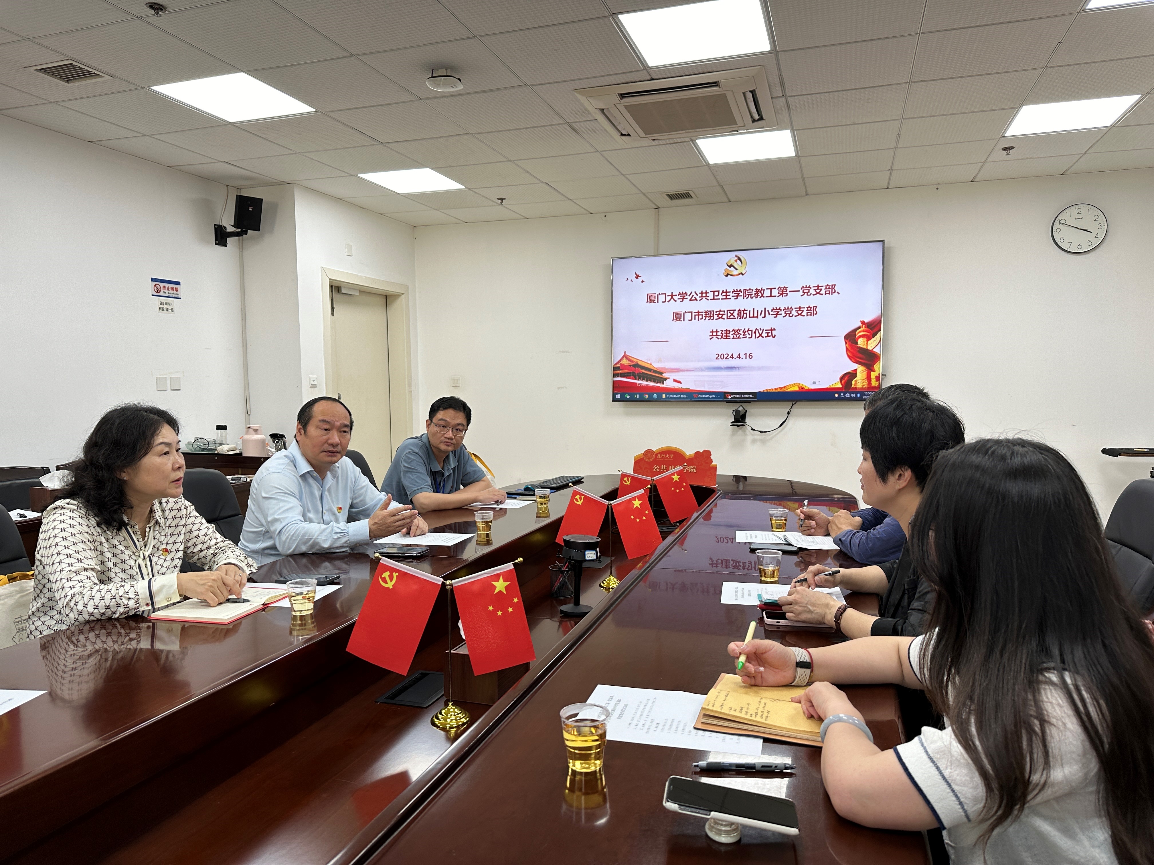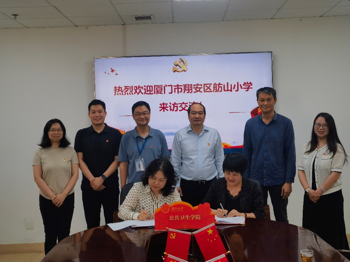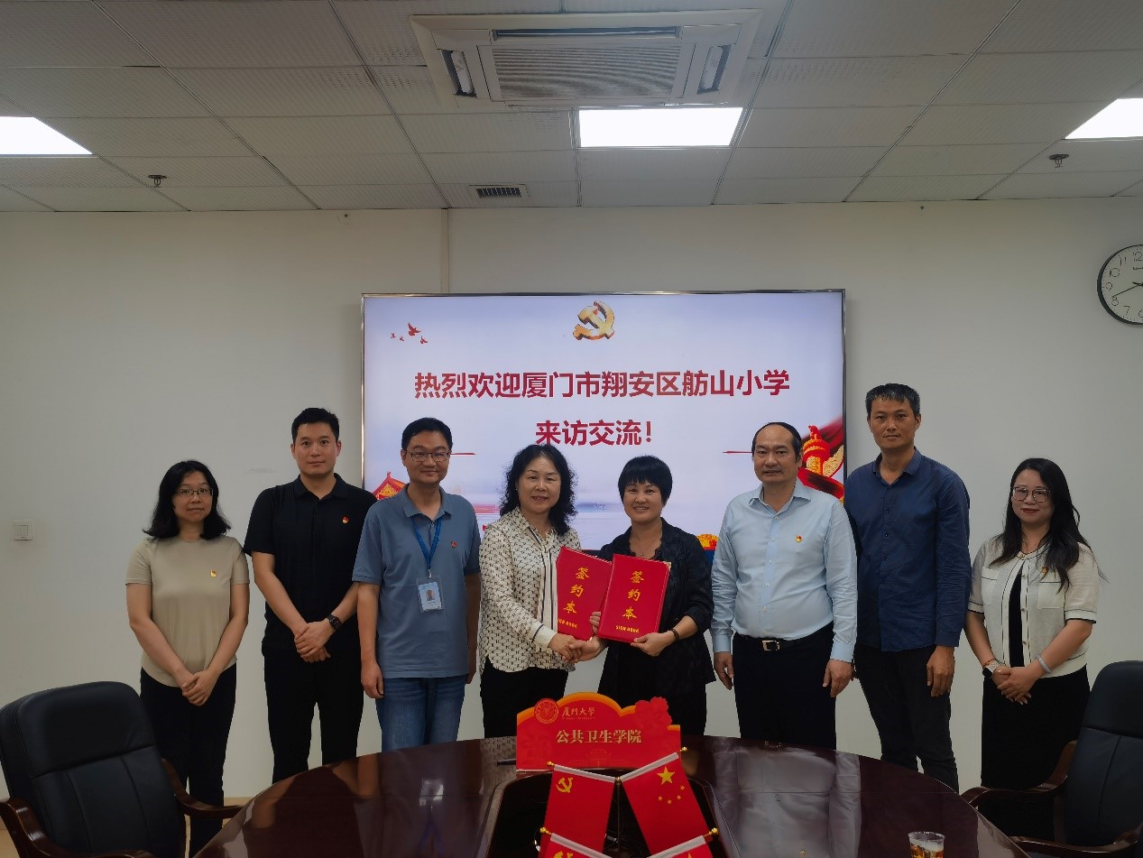 为构建党建工作新格局,实现资源高效利用和优势最大化发挥,在秉持“资源共享、优势互补、互相促进、共同提高”的原则基础上,我院教工第一党支部积极开展党组织间的合作交流。2023年起,教工第一党支部充分发挥“公共卫生”专业优质科教资源,创新打造“健康舫山”党建品牌,为创建和谐奋进的校园环境,提升小学师生健康素养,培养师生健康观念和健康生活方式贡献厦大公卫力量。