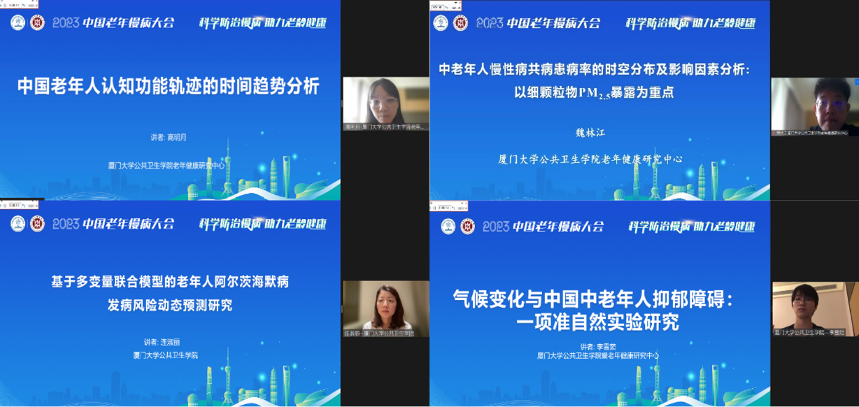 在本次大会的811项投稿中,我院高明月老师和硕士研究生连淑丽、魏林江、李雪茹的投稿论文获得一等奖,并受邀作口头汇报,向与会学者分享关于慢性病共病、抑郁、阿尔兹海默症、认知功能等领域的最新研究成果。高明月老师在研究中,利用多项中老年纵向队列,探讨了过去20年间中老年人认知功能轨迹的时间趋势。该研究创新性地利用了多项具备年龄互补性的队列数据,采用适宜的纵向数据方法对认知功能轨迹进行模拟,相关研究内容引起了参会学者的广泛兴趣和积极讨论。此外,我院师生围绕“科学慢病防治,助力老龄健康”主题,学习交流了我国老年慢病现状及面临的挑战、老年健康教育与照护、大健康思维开展慢病管理、共病管理等学术前沿内容。