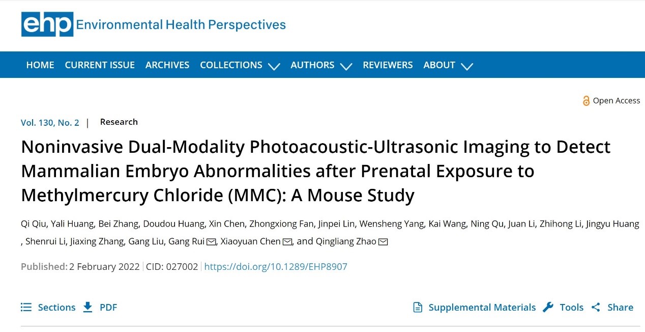 近日,环境与公共卫生健康领域国际顶级期刊Environmental Health Perspectives刊发了我院分子影像中心赵庆亮团队题为“Noninvasive Dual-Modality Photoacoustic-Ultrasonic Imaging to Detect Mammalian Embryo Abnormalities after Prenatal Exposure to Methylmercury Chloride (MMC): A Mouse Study”的研究论文,该研究实现了产前氯化甲基汞(MMC)暴露的胚胎不同发育阶段的非入侵、高分辨活体成像,弥补传统单一成像技术的不足,揭示了MMC体内富集对胚胎心脏发育具有一定的延缓与停滞效应,重则导致器官畸形与功能障碍及胎儿流产。该研究为哺乳动物胚胎毒性效应及毒理机制提供新的技术手段,为探索汞衍生重金属污染物的生态与公共卫生健康的评价提供新思路。本研究工作同时被Environmental Health Perspectives选在Science Selection板块作为新闻报道。