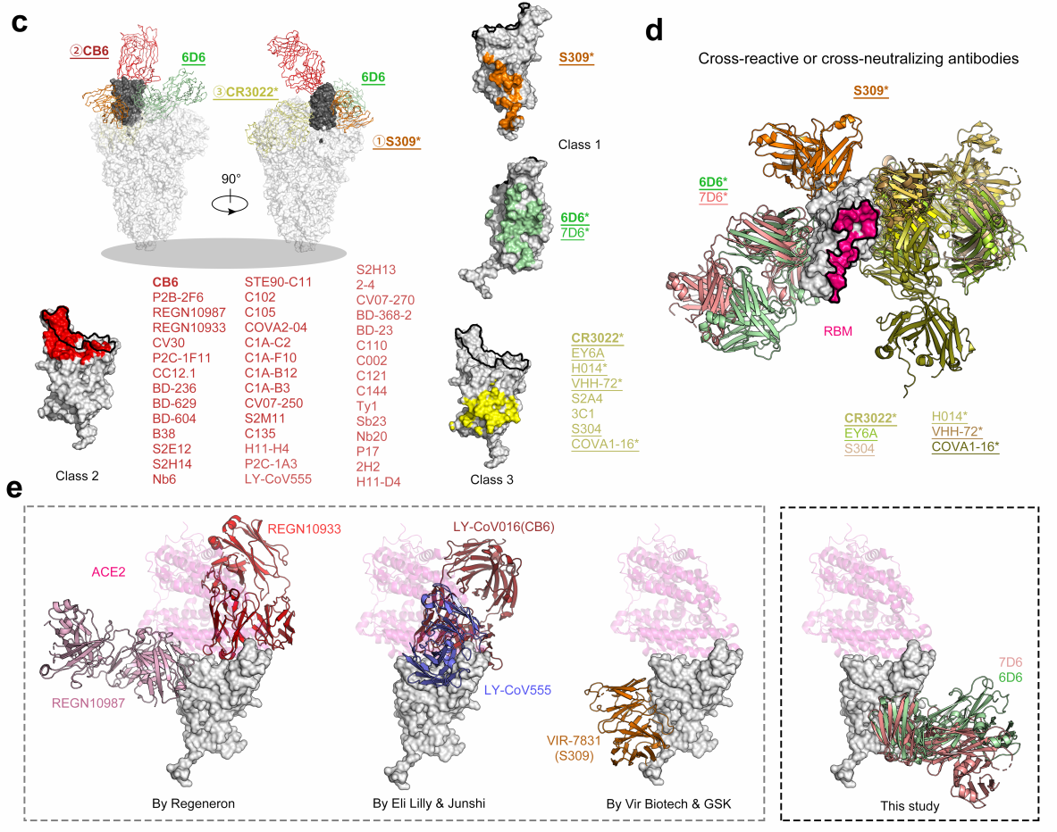 广谱中和抗体7D6/6D6识别表位及与其他已报道新冠抗体比较