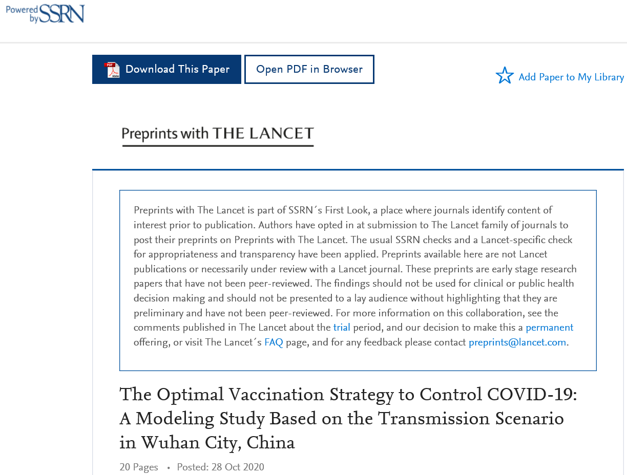我院流行病学课题组与中国疾病预防控制中心牛艳博士和法国蒙彼利埃大学Roger Frutos教授团队合作在柳叶刀预印网站SSRN上公开了新冠肺炎疫苗最优评估方案研究结果。