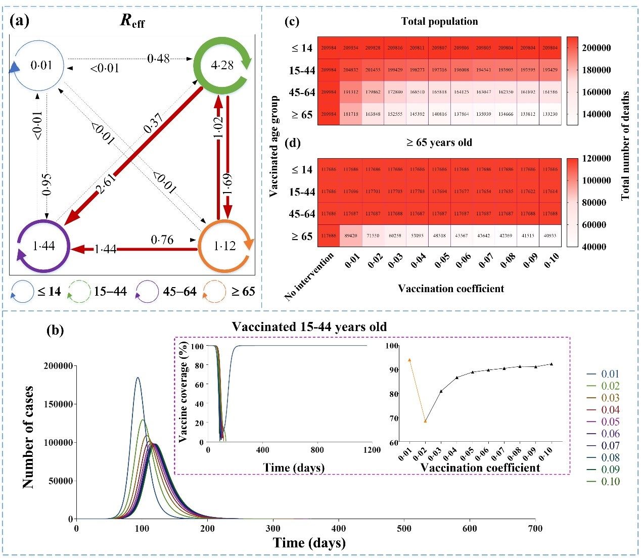 该研究基于课题组已构建的多种群和多途径的新冠肺炎传播动力学模型(Infectious Diseases of Poverty, 2020a, 入选高被引论文)、人传人的新冠肺炎SEIAR模型(China CDC Weekly, 2020)、跨年龄组传播的新冠肺炎动力学模型(Infectious Diseases of Poverty, 2020b)、以及流行病学特征论文(Open Forum Infectious Diseases, 2020),构建了新冠肺炎不同人群结构(年龄组)的传播动力学模型,将总人群分为4个年龄组(£14岁,15-44岁,45-64岁和³65岁),以类似于武汉这样的超级城市为人口学和传播模式背景,计算传播能力,并模拟了新冠肺炎疫苗两种可能的场景:一是接种疫苗后可以降低疾病的传染性;二是接种疫苗后可以降低疾病严重性。