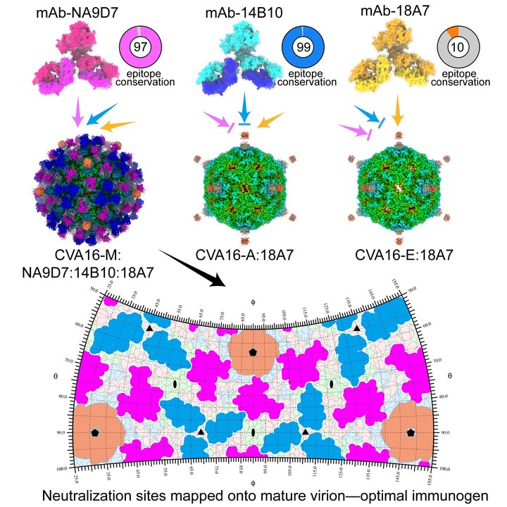 该研究系统阐释了CVA16主要中和表位的精确特征,发现了与CVA16疫苗免疫原性和交叉中和能力相关的关键的免疫优势和广谱中和表位,阐明了CVA16成熟颗粒是疫苗主要保护性免疫原的理论依据,建立了疫苗主要保护性免疫原的特异检测方法,可为CVA16疫苗和特异性治疗药物的研究提供关键基础。研究发现了三株具有不同特性的CVA16单克隆中和抗体(18A7、14B10和NA9D7),18A7可结合CVA16三种不同病毒颗粒成熟颗粒(Mature virion)、脱衣壳中间态(A-particle)和空心颗粒(Empty particle),而NA9D7和14B10特异结合CVA16成熟颗粒。研究应用冷冻电镜技术分析上述中和抗体与不同病毒颗粒类型的免疫复合物并揭示了结合表位的精确信息,发现18A7、14B10和NA9D7分别识别病毒的五倍轴、三倍轴和二倍轴位置,对应的表位空间上互不重叠。进一步分析显示,14B10和NA9D7结合表位具有高度保守性,18A7表位保守性较差,特异拥有14B10和NA9D7保守表位的成熟颗粒的免疫原性和广谱中和性能优于失去上述表位的空心颗粒。研究明确了CVA16成熟颗粒为疫苗主要保护性免疫原的科学理论依据,并设计了基于抗体结合特异性的免疫分析方法,可用于指导疫苗免疫原设计和疫苗抗原的质量控制。这些发现进一步丰富了小RNA病毒的结构信息及抗病毒作用机制的病毒学理论,也证明了通过建立并分析可全面覆盖病毒颗粒主要结构域的中和表位信息对于准确鉴定病毒主要保护性免疫原的重要性,可为其它重要病毒的疫苗设计提供指导。