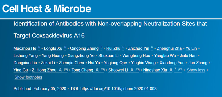 2月5日,我院夏宁邵教授团队在《细胞》子刊《细胞•宿主与微生物》(Cell Host & Microbe)上在线发表题为“Identification of antibodies with non-overlapping neutralization sites that target coxsackievirus A16”的研究论文。该研究首次揭示了手足口病主要病原体柯萨奇病毒A组16型(CVA16)三种衣壳颗粒形式与三种不同类型的治疗性中和抗体的全面相互作用细节和非重叠的中和表位结构信息,阐明了CVA16成熟颗粒是疫苗候选主要保护性免疫原的理论基础,建立了可指导疫苗研制的免疫原特异检测方法,为CVA16疫苗及抗病毒药物研究提供关键基础。这是夏宁邵教授团队在《自然•通讯》(Nature Communications,2017)、《科学•进展》(Science Advances,2018)和《自然•微生物学》(Nature Microbiology,2019)上发表手足口病重要病原体CVA6、CVA10和EVD68研究论文后的又一项关于肠道病毒的重要研究成果,为深入认识肠道病毒的组装、感染和中和机制,以及新型疫苗和治疗药物的研发奠定了重要理论基础。