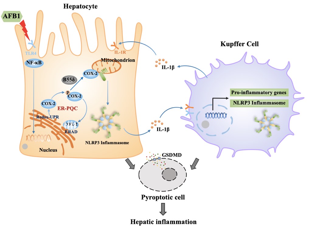 该团队研究发现,体内、离体和体外试验阐明COX-2Ser601去磷酸化激活肝细胞NLRP3依赖性焦亡,经由肝细胞与KC的细胞间通讯,介导肝脏局部免疫依赖性肝脏炎性反应和毒性损伤的分子机制。结果提示COX-2去磷酸化修饰调控AFB1肝毒性的新模式,为筛查COX-2作为外源物诱导肝脏炎性损伤的干预靶点提供理论依据。