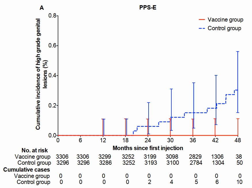 该研究是在全国4个中心5个现场的18-45岁健康女性中进行的多中心、随机、双盲、对照(戊肝疫苗)的三期临床试验,共入组7372名志愿者(试验组3689人、对照组3683人)。三期临床试验期中分析的结果显示,在符合方案(PPS)人群中,受试疫苗对HPV 16型和/或18型感染相关的病变终点(CIN2+和/或VIN2+和/或VaIN2+)的保护率为100.0%(95% CI: 55.6% - 100.0%),对HPV 16型和/或18型持续性感染(6月以上)的保护率为97.8%(95% CI: 87.1% - 99.9%)。在试验期间未发生与疫苗接种相关的非预期不良反应和严重不良事件,未发生与疫苗接种相关的妊娠结局和新生儿健康状况的异常。受试疫苗可有效诱导受试者产生较高水平的HPV 16型和18型中和抗体和IgG抗体并维持至少42个月。该研究结果证实我院自主研发的双价人乳头瘤病毒疫苗(大肠杆菌)具有良好的安全性、免疫原性和免疫持久性,可有效地预防HPV 16型和/或18型相关的宫颈高度癌前病变及持续性感染。