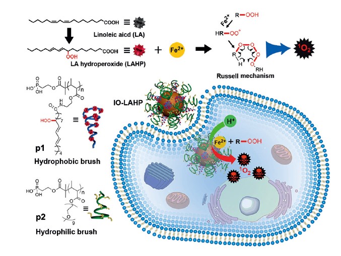 活性氧(ROS)诱导的细胞凋亡已广泛应用于癌症治疗。尽管光动力治疗(PDT)受益于活性氧生成的空间 —时间控制,但其对光、光敏剂和氧气的精细搭配需求极大地阻碍了PDT作为癌症治疗选择的首选。本研究团队开发了一种基于铁氧化物的肿瘤特异性酸性pH可控释放单线态氧的纳米颗粒。酸性条件下,铁氧化物颗粒(IO-LAHP)释放的铁(II)离子与纳米颗粒表面的亚油酸氢过氧化物(LAHP)之间发生类Fenton反应,实现了基于ROS介导机制的肿瘤特异性治疗。体外细胞实验表明IO-LAHP NPs可有效的提高肿瘤细胞内ROS水平,进而诱发凋亡性癌细胞;体内小鼠肿瘤模型实验进一步证实了其对小鼠肿瘤的生长有明显的抑制作用。本研究提出了一种基于生物化学反应药物实现可控特异性肿瘤治疗的新方法。
