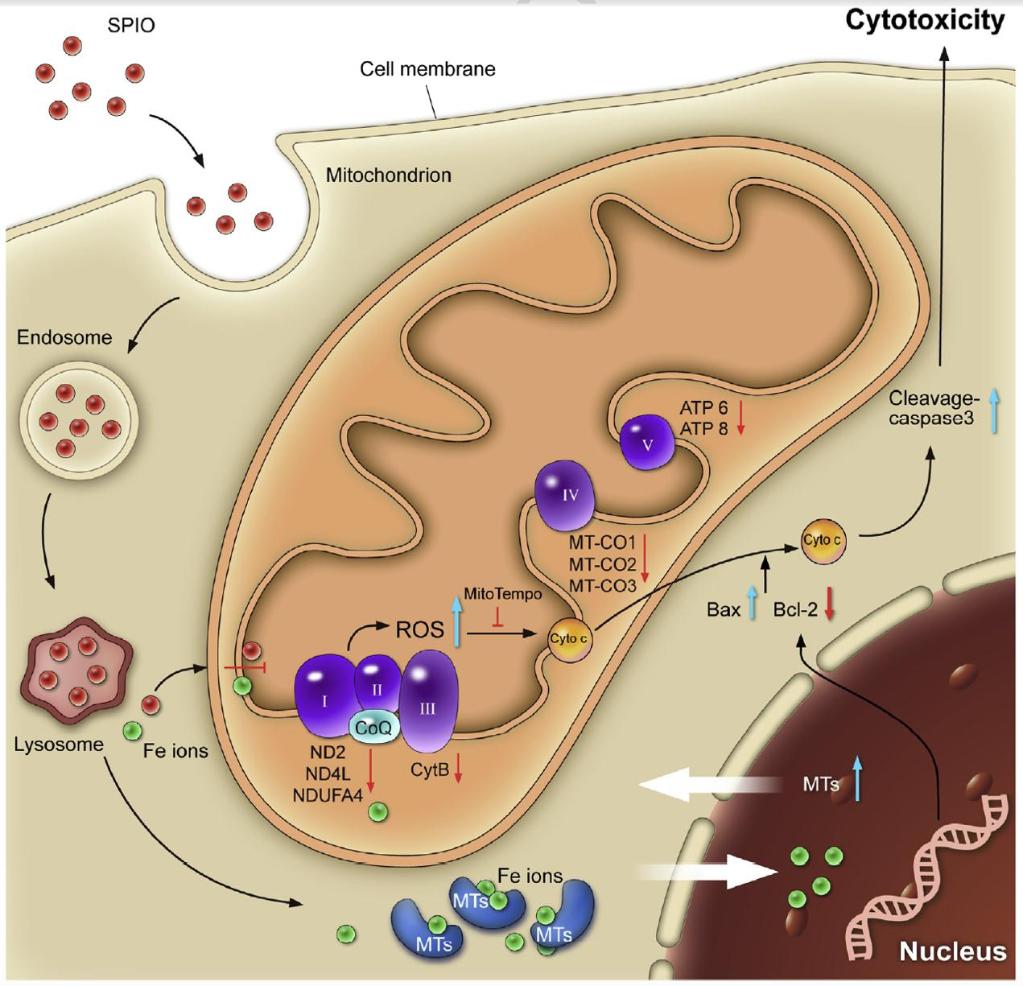 该成果发现超顺磁氧化铁纳米颗粒(SPIONs)能够选择性作用于多种癌细胞并诱导癌细胞凋亡。SPIONs通过胞吞胞饮方式进入癌细胞后形成吞噬小体,转运至溶酶体后使一部分SPIONs降解释放出铁离子。游离的铁离子诱导金属硫蛋白基因和蛋白的高表达,进而导致线粒体膜电位(MMP)降低和细胞色素c从线粒体释放入胞浆,最终诱导了线粒体依赖性凋亡。同时SPIONs能够特异性的靶向癌细胞线粒体电子传递链(METC)导致线粒体ROS升高。线粒体ROS也能损伤线粒体膜导致细胞色素c的释放,然后触发凋亡机制。SPIONs能够选择性影响癌细胞线粒体功能是因为:相对于正常细胞,癌细胞谷胱甘肽(GSH)水平、线粒体特异抗氧化基因(如GRLX5、HSPA9)表达更低,致使其对ROS的敏感性更强。而在细胞中加入外源GSH或线粒体ROS特异性清除剂MitoTempo则能显著抑制癌细胞凋亡,进一步验证了该分子机制。该研究成果对SPIONs类纳米材料的生物医学应用和安全性评价方面具有重要的指导意义。