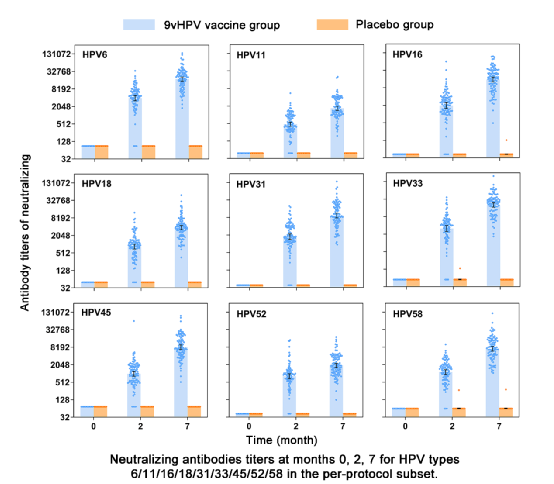 为了进一步探究该疫苗在更大规模健康女性人群中的免疫原性和安全性,研究团队于2019年在江苏省东台市开展了一项随机、双盲、空白佐剂(安慰剂)对照的II期临床试验。研究共入组627名18-45岁健康女性志愿者,1:1随机分配至九价疫苗组或安慰剂对照组,并按照0天、1个月、6个月三剂次免疫程序接种九价疫苗或空白佐剂对照,随访接种后的各种不良事件并采集系列血清检测针对9个型别HPV的抗体阳转率和抗体水平。结果显示,所有按程序完成九价疫苗免疫的志愿者中均在末次接种后1个月检出了针对九个HPV型别的血清中和抗体和/或IgG抗体阳转。九价疫苗组和对照组的总体不良事件(无论是否与疫苗相关)相近,绝大多数不良事件症状轻微并很快恢复,未发生与该疫苗相关的严重不良事件,表明该疫苗安全性良好。该研究证实了国产HPV九价疫苗馨可宁®9在我国18-45岁健康女性中的免疫原性和安全性,为该疫苗的后续保护效力研究以及注册上市奠定了坚实基础。