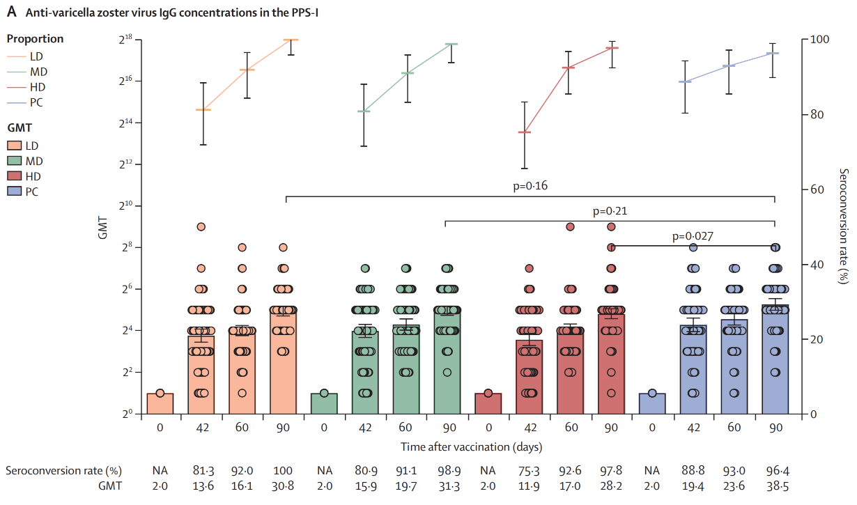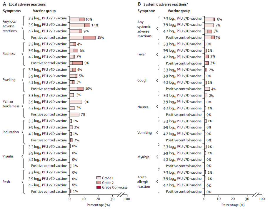 由我院夏宁邵团队和万泰生物联合研发的一种嗜神经因子ORF7基因缺失的新型水痘减毒活疫苗(v7D)对人皮肤与神经细胞明显减毒,与现有vOka疫苗相比可能可明显降低疫苗株相关疾病的风险,具有成为新一代更安全的水痘减毒活疫苗的潜力。前期已在临床前和I期临床试验中初步验证了安全性和免疫原性(Nat Commun. 2022; 13(1):824;Lancet Reg Health West Pac. 2023; 34:100707)。为进一步全面评估v7D疫苗诱导的体液免疫和细胞免疫应答,研究团队于2020年在江苏赣榆开展了一项单中心、随机、双盲、阳性对照的IIa期临床研究。研究共入组了842名3-12岁健康志愿者,按1:1:1:1随机分配接种1剂低剂量、中剂量或高剂量的v7D疫苗或阳性对照(vOka)疫苗,评价疫苗的体液免疫及细胞免疫。在符合方案人群中,v7D疫苗的低、中、高剂量组与阳性对照vOka疫苗组的体液免疫应答和细胞免疫应答均相似。免后90天的抗体阳转率分别为100.0%、98.9%、97.8%和96.4%,平均抗体滴度分别为30.8、33.1、28.2和38.5;免后42天的细胞免疫应答阳转率分别为95.5%、90.5%、93.3%和88.0%,IFN-γ水平分别为87.0 pg/mL、122.0 pg/mL、89.0 pg/mL和96.0 pg/mL。v7D疫苗低、中、高剂量组的不良反应发生率低于vOka疫苗组(17%、20%、13%和24%,p=0.025),尤其是局部不良反应(10%、14%、9%和18%,p=0.016)。未发现与疫苗有关的严重不良事件。该研究结果提示v7D水痘疫苗的三个剂量组表现出与vOka疫苗相似的体液免疫和细胞免疫,并且安全性良好。