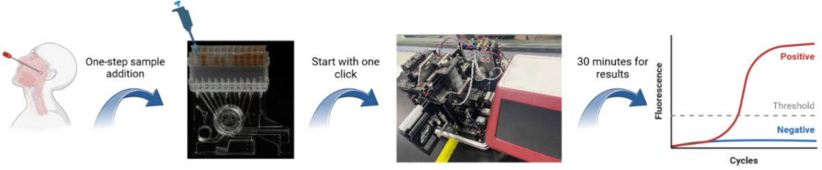 核酸检测直接面向病原体的遗传物质,具有高灵敏度和高特异性的特点,在传染性疾病的筛查和诊断中不可或缺。然而,传统的核酸检测方法依赖于专业实验室和经过严格训练的检验人员,通常需要多台设备联合操作,手工步骤繁琐,耗时费力且存在污染风险,总检测时间长达3-5小时,无法实现现场快速检测和“样品进,结果出”的效果。为了突破这一局限,我院夏宁邵、葛胜祥、张东旭团队设计并开发了一种全自动微流控核酸现场快速检测系统,在紧凑的225mm×335mm×264mm空间内设计集成了核酸提取的全部流程及qPCR所需的变温和光学模块,并搭配了预封装试剂的微流控检测芯片作为生化反应场所。该系统通过仪器与芯片的协同耦合实现多物理场的高效控制,能够在30分钟内实现包括完整提取流程与45个扩增循环在内的全自动核酸定量检测。在新冠注册检中表现优异,灵敏度达到22拷贝/毫升,且检测精密度控制在2%以内。