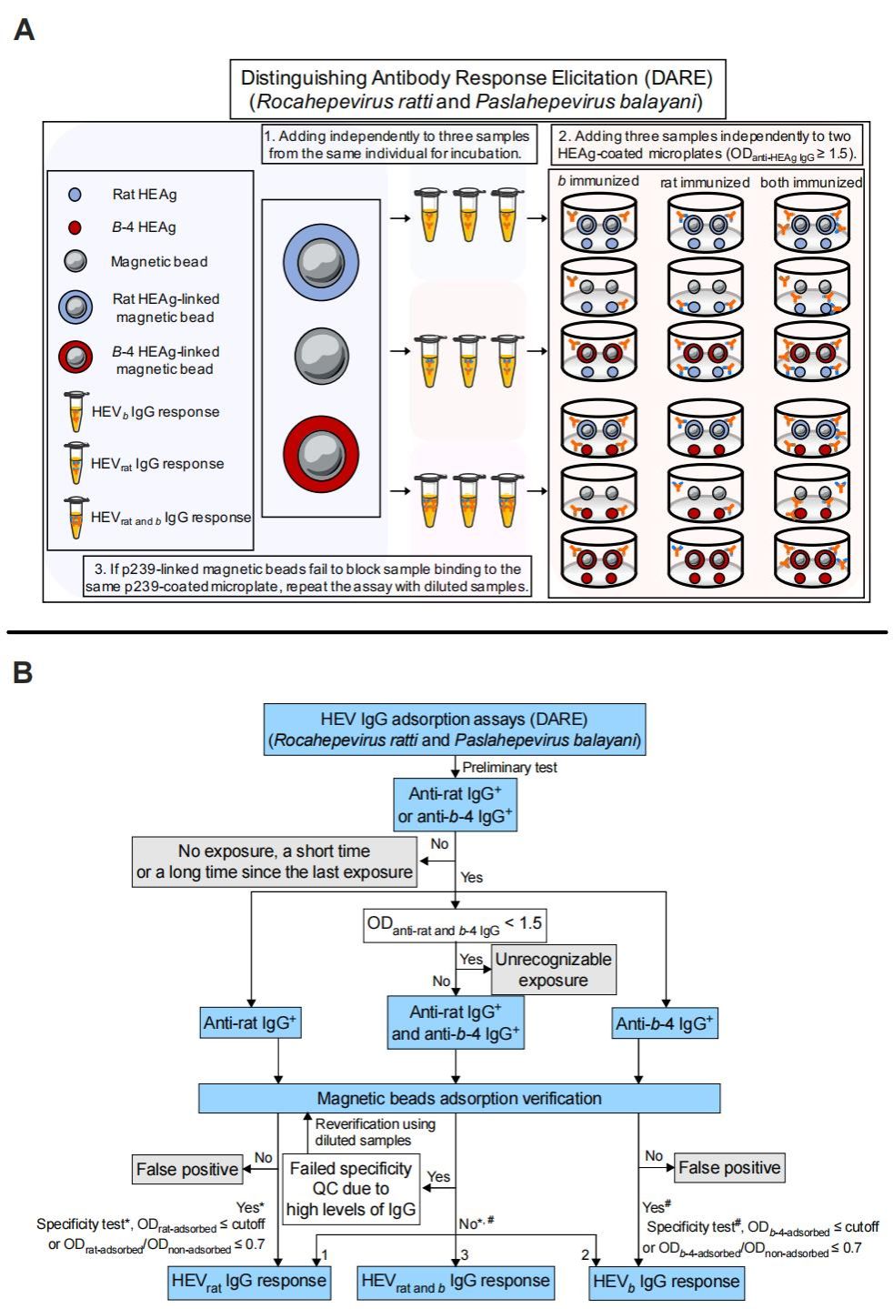 鉴于此,我院夏宁邵、郑子峥教授团队开发了基于抗原竞争法的“区分抗体应答激发 (Distinguishing Antibody Response Elicitation,DARE)”的检测路线(图1A)。该技术分别使用两种病毒衣壳蛋白偶联的磁珠,通过与底板包被的衣壳蛋白竞争血清中IgG的结合,定量化衡量两种病毒衣壳蛋白的既往暴露权重。并利用衣壳抗原免疫的小鼠血清以及既往感染的沙鼠血清,初步建立了评估既往暴露情况的标准化流程及合理可判别阈值(图1B)。