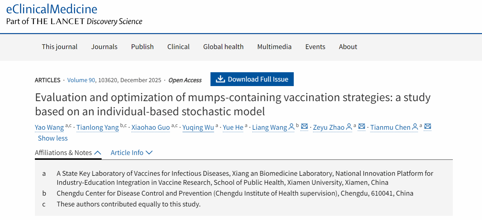 近日,我院陈田木副教授团队在《柳叶刀》子刊eClinicalMedicine上发表题为“Evaluation and optimization of mumps-containing vaccination strategies: a study based on an individual-based stochastic model”的研究论文,该研究通过构建传染病个体随机模型,系统评估了16种流行性腮腺炎疫苗接种策略,为优化全球免疫规划提供重要科学依据。