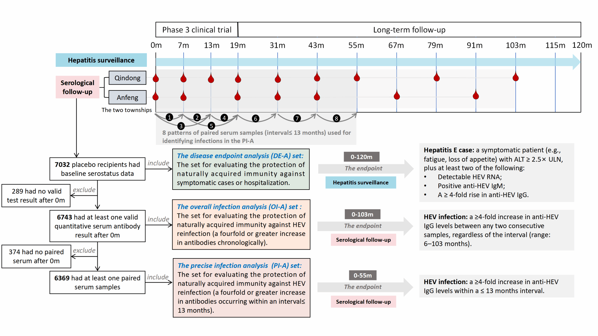 为探究该问题,我院夏宁邵教授、张军教授团队基于此前在江苏省东台市开展的戊肝疫苗(Hecolin®)III期临床试验免疫原性亚组中的长期血清学随访数据进行探索分析,系统评估自然感染抗体对HEV再感染及戊型肝炎的保护作用(图1)。免疫原性亚组中对照组受试者接种的是乙肝疫苗,体内的戊肝抗体由自然感染诱导产生,而前后相邻两份血样的抗体变化情况可用来评估是否发生HEV感染,因此该队列可用来评估自然感染抗体的保护作用。最终,研究纳入7032名具有基线抗体数据的受试者,根据基线HEV IgG抗体状态分为血清阳性(n=3194)和血清阴性(n=3838)两组,并根据不同研究终点和采血间隔设立三个分析集进行评估,包括:(1)疾病终点分析集(DE-A,n=7032),用于评估队列10年随访期间针对戊型肝炎疾病或住院的保护作用;(2)感染终点总体分析集(OI-A,n=6743),覆盖0~103个月内的所有HEV感染事件,相邻两份血样之间的间隔时长不作限制;(3)感染终点精确分析集(PI-A,n=6369),聚焦0~55个月内配对血样间隔时长≤13个月的HEV感染事件。HEV感染定义为配对或相邻的两份血清样本中抗HEV IgG浓度出现至少4倍升高,而临床戊型肝炎则是通过服务于整个III期临床试验及10年延续性观察的肝炎主动监测系统捕获,最终结合症状、ALT升高(≥2.5倍正常上限)及至少两项实验室指标(HEV RNA阳性、IgM阳性或IgG≥4倍升高)确诊。