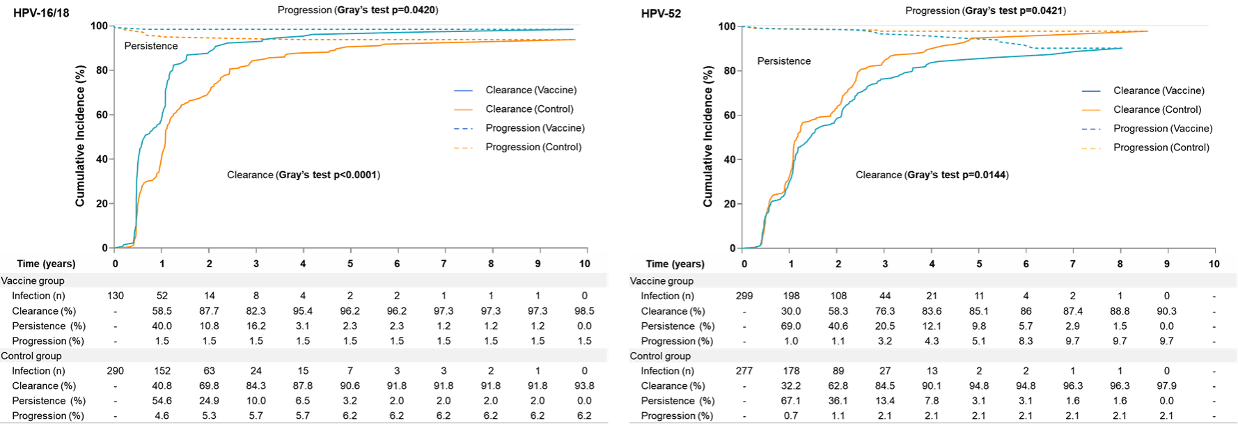 图2. HPV-16/18和HPV-52感染后清除和进展情况