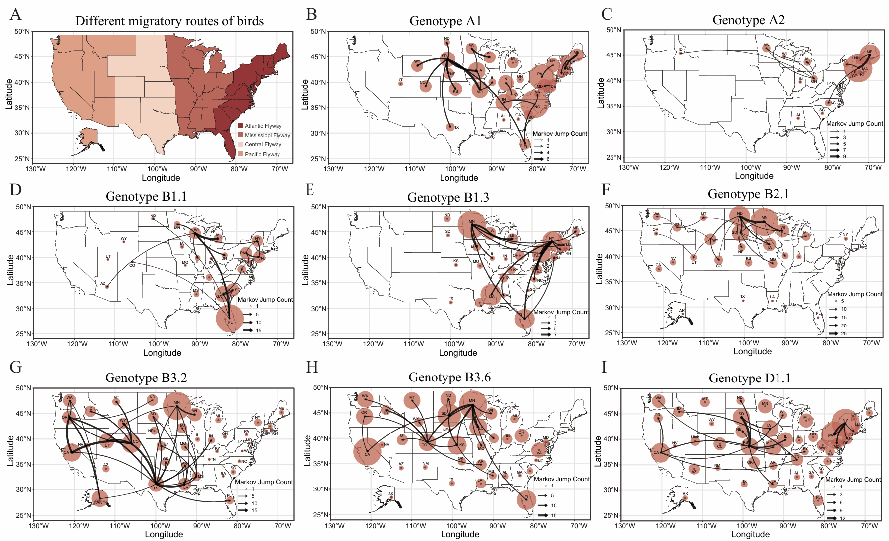 病毒演化与空间扩散:美国野鸟中的病毒种群正从高多样性(2022年多基因型共存)向单一优势基因型(2025年的D1.1)演化。系统发育地理重建显示,早期基因型(如A1, A2, B2.1)的传播局限于单条迁徙带,而D1.1基因型形成了横跨全美四大迁徙带的广泛传播网络,提示其可能具有更广的宿主谱或更强的环境适应力。