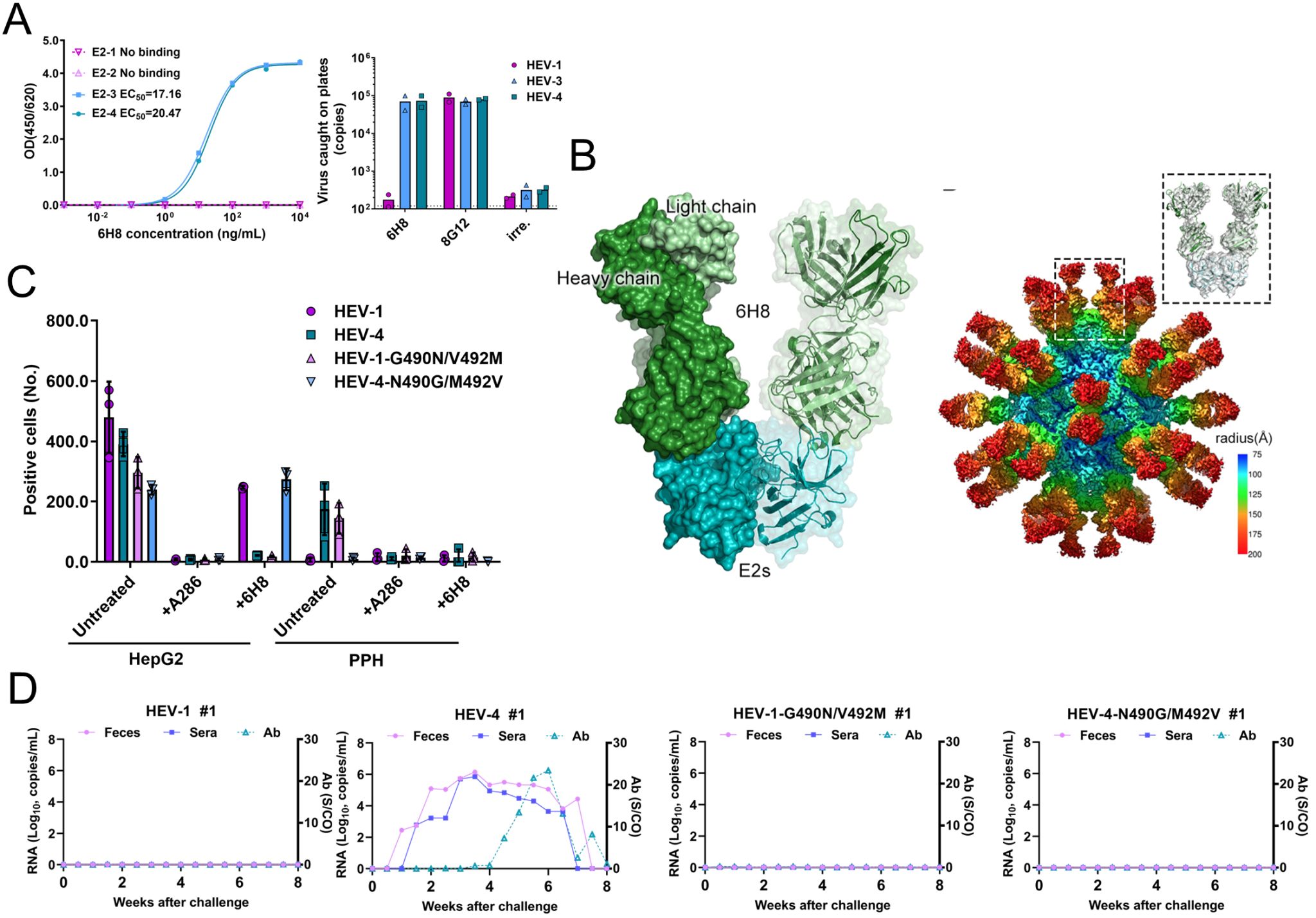 我院夏宁邵教授、郑子峥教授团队利用一株特异性识别HEV-3和HEV-4的单克隆抗体6H8作为“分子探针”,成功鉴定出HEV衣壳蛋白上一个仅存在于HEV-3和HEV-4的特异性抗原表位。通过晶体结构和冷冻电镜(Cryo-EM)分析,该抗原表位被精确定位于衣壳蛋白二聚体的头部区域,由480-loop和530-loop两个表面环区共同构成。序列比对及结构分析进一步揭示,在这两个表位关键环区中,483、490及492三个位点在HEV-1/2和HEV-3/4间存在保守性差异,其中490和492位氨基酸直接参与抗体6H8的相互作用。具体而言,在HEV-1/2中,490和492位分别为甘氨酸(G)和缬氨酸(V),而在HEV-3/4中则对应为天冬酰胺(N)和甲硫氨酸(M)。突变验证和动力学分析结果显示,490位天冬酰胺(490N)是抗体6H8与HEV衣壳蛋白特异性结合的关键决定因素,而492位甲硫氨酸(492M)对维持该抗原表位的稳定构象发挥重要作用。细胞模型实验结果显示将HEV-4的490N/492M突变为HEV-1的490G/492V后,其对猪肝细胞的感染能力完全丧失;反之,将HEV-1的490G/492V突变为490N/492M后,HEV-1获得了吸附和感染猪肝细胞的能力。进一步的动物体内实验结果证实,HEV-4的490G/492V突变体完全破坏其对猪的感染能力;但HEV-1的490N/492M突变体则无法重建其对猪的体内感染能力。这一结果表明,尽管490N/492M是HEV感染猪的关键因素,但HEV-3/4对猪的感染能力还受到其他未知或协同因素的共同调控。