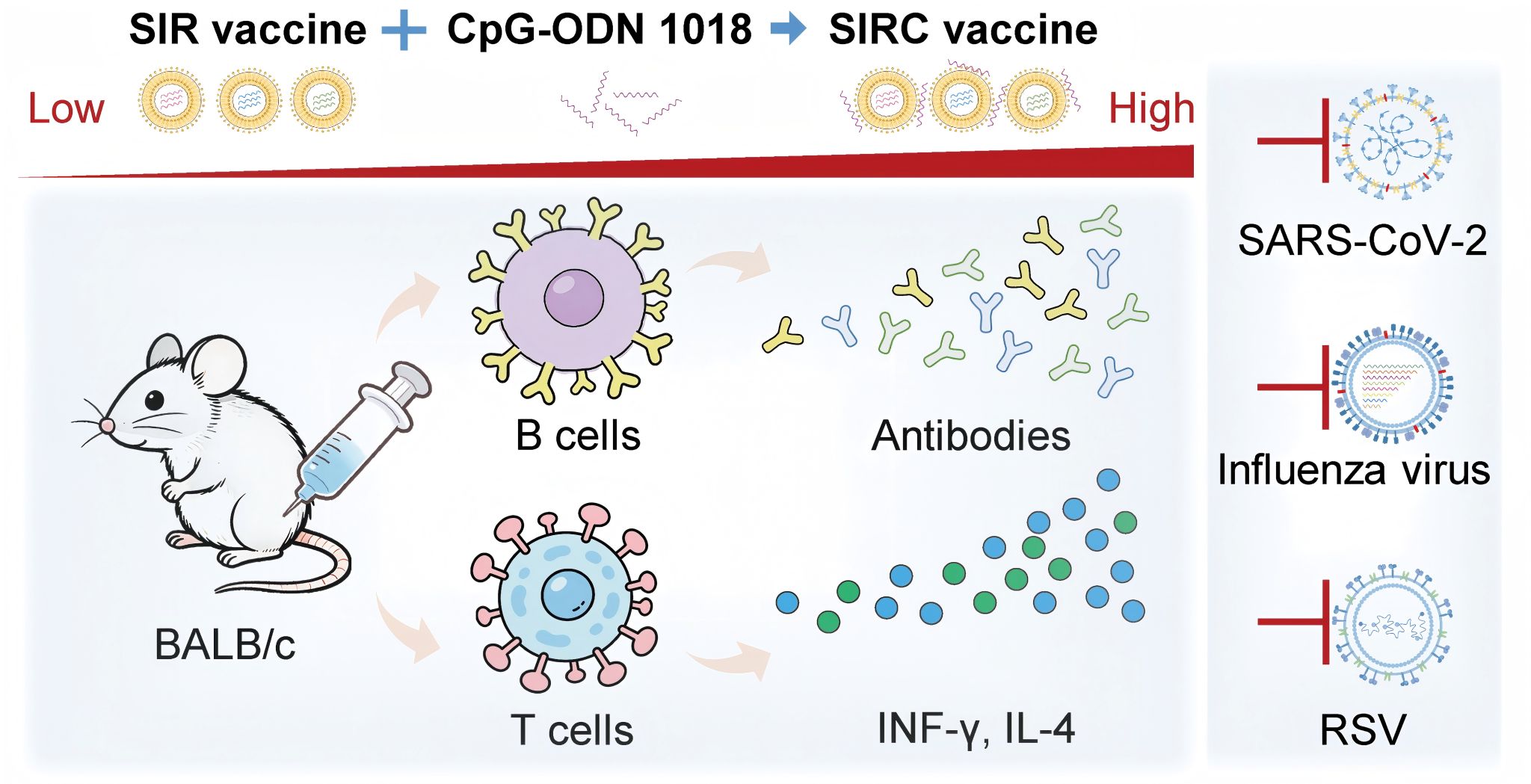 研究显示,SIRC疫苗在小鼠模型中可高效诱导针对三种病毒的体液免疫与细胞免疫应答。其诱导产生的结合抗体、中和抗体滴度与单价疫苗相当或者更高;在细胞免疫方面,SIRC疫苗诱导的针对三种的病毒的IFN-γ⁺ T细胞应答,较SIR疫苗最高提升约4.5倍,较单价疫苗最高提升约10倍,并成功诱导CD4⁺和CD8⁺效应记忆T细胞(TEM)形成,为长期免疫保护奠定基础。安全性评价显示SIRC疫苗安全性和耐受性良好。针对新冠病毒,SIRC免疫组诱导了针对新冠病毒变异株的交叉中和抗体,CD4+T细胞免疫反应显著高于SIR免疫组;在A/California/04/2009 (H1N1)、A/Beijing/32/1992 (H3N2)、B/Brisbane/60/2008 (B/Victoria)和B/Florida/4/2006 (B/Yamagata)等四种流感病毒株的致死性攻毒实验中,SIRC疫苗组受试小鼠全部存活,防护效果优于单独的流感疫苗;在RSV攻毒实验中,SIRC免疫组小鼠肺部病毒滴度和组织病理学评分显著优于单价RSV疫苗。综上,相较于未添加佐剂的SIR疫苗,SIRC在抗体水平、细胞免疫和保护效果方面均表现更加出色,证明了CpG佐剂在联合疫苗中的关键增强作用。