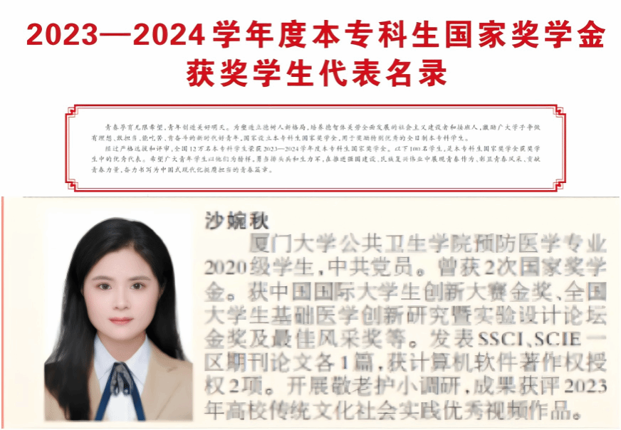 近日,《人民日报》专版刊登《2023—2024学年度本专科生国家奖学金获奖学生代表名录》,我院2020级预防医学专业沙婉秋同学入选。