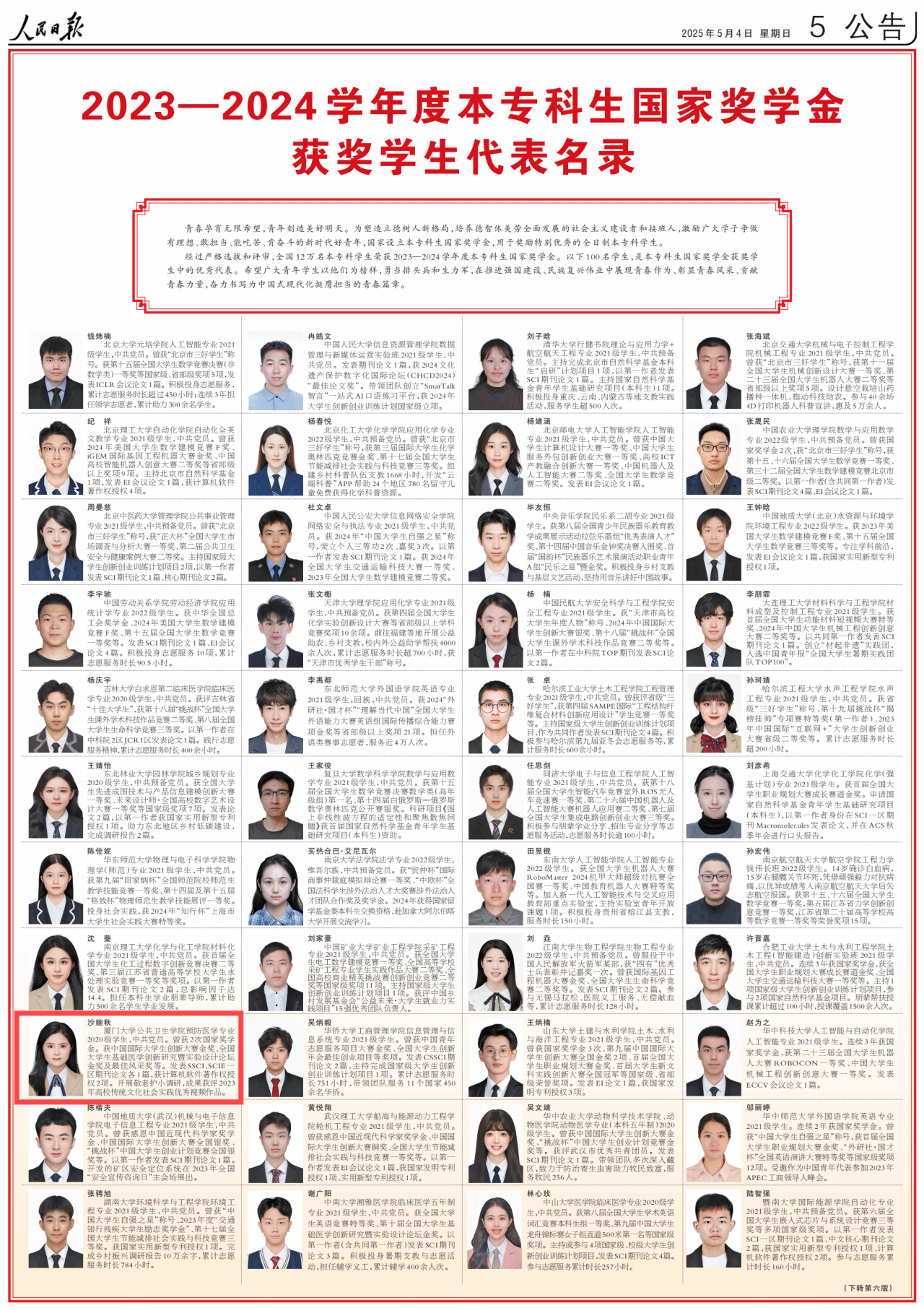 为落实立德树人根本任务,国家设立本专科生国家奖学金,激励青年学子奋发有为。经严格选拔,全国12万名本专科生荣获2023—2024学年度国家奖学金,其中100名本专科生国家奖学金优秀获奖代表荣登《人民日报》。