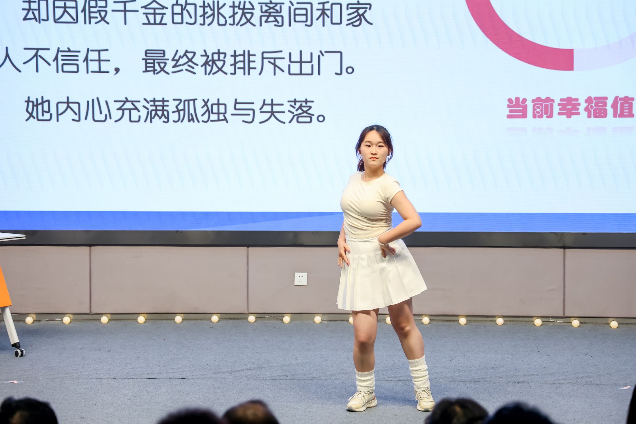 决赛分为汇报展示和风采展示两个环节。我院参赛作品《幸福系统》以新颖的创意和深刻的立意获得一致好评。该剧讲述了主人公意外绑定神秘“幸福系统”后,在校园中开展助人之旅的温暖故事。剧中主人公通过“从真千金到穿越女”的角色转变,凭借“转念”的积极心理学方法化解困境、传递幸福,最终收获成长与温暖。