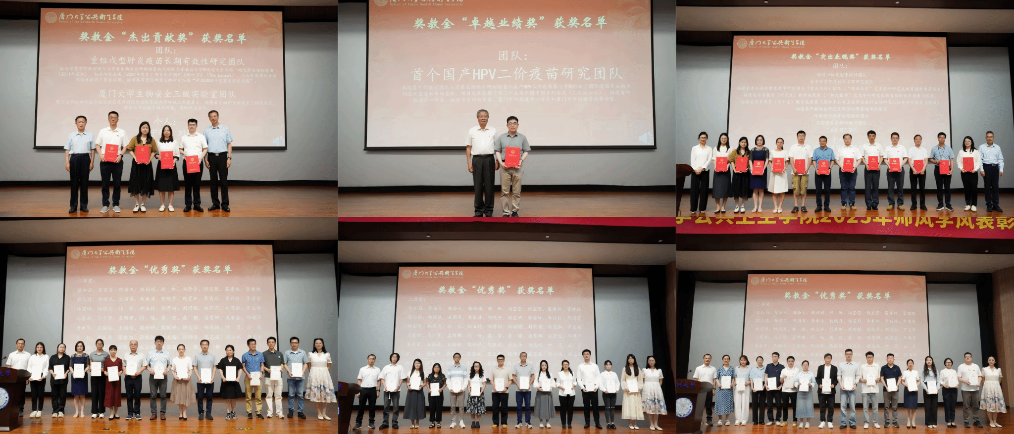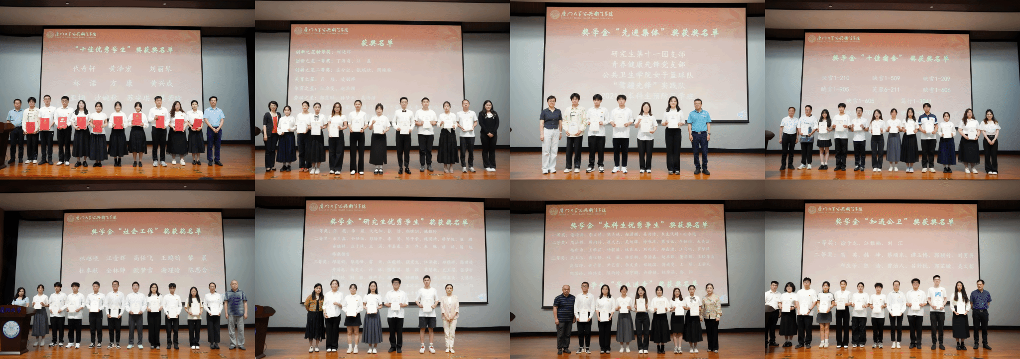 张军宣读表彰决定,授予刘刚等82位老师和重组戊型肝炎疫苗长期有效性研究团队等12个集体学院奖教金;授予代奇轩等154名学生和“鹭疆先锋实践队”等16个集体学院奖学金。