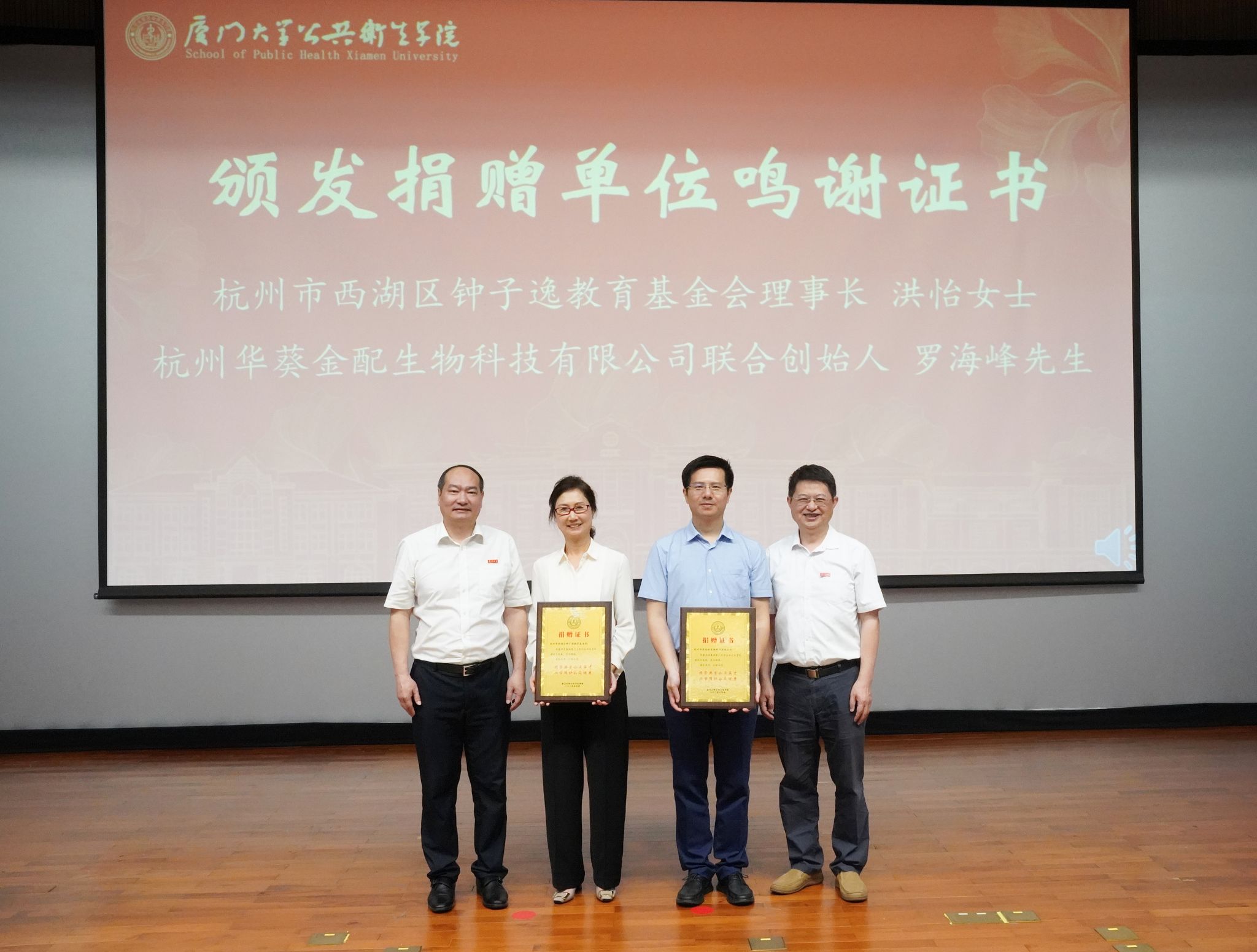 厦门大学关工委常务副主任赖虹凯,翔安校区管委会副主任刘俊杰,公共卫生学院第四届教授委员会主任滕伯刚,校基层党建工作联络员黄田,教师工作部副部长杨建中,研究生院学位管理办公室副主任陈春萍,教务处副处长郑炜,校团委副书记、翔安校区团工委书记郑音,公共卫生学院党委书记张琥、院长张军等学院领导及师生出席会议。杭州市西湖区钟子逸教育基金会理事长洪怡、马羽佳,杭州华葵金配生物科技有限公司联合创始人罗海峰等捐赠单位代表,浙江省疾病预防控制中心主任、党委副书记陈直平,以及浙江、江苏、福建、北京市朝阳区、厦门等地疾病预防控制中心代表应邀参会。会议由学院党委副书记刘君彬主持。