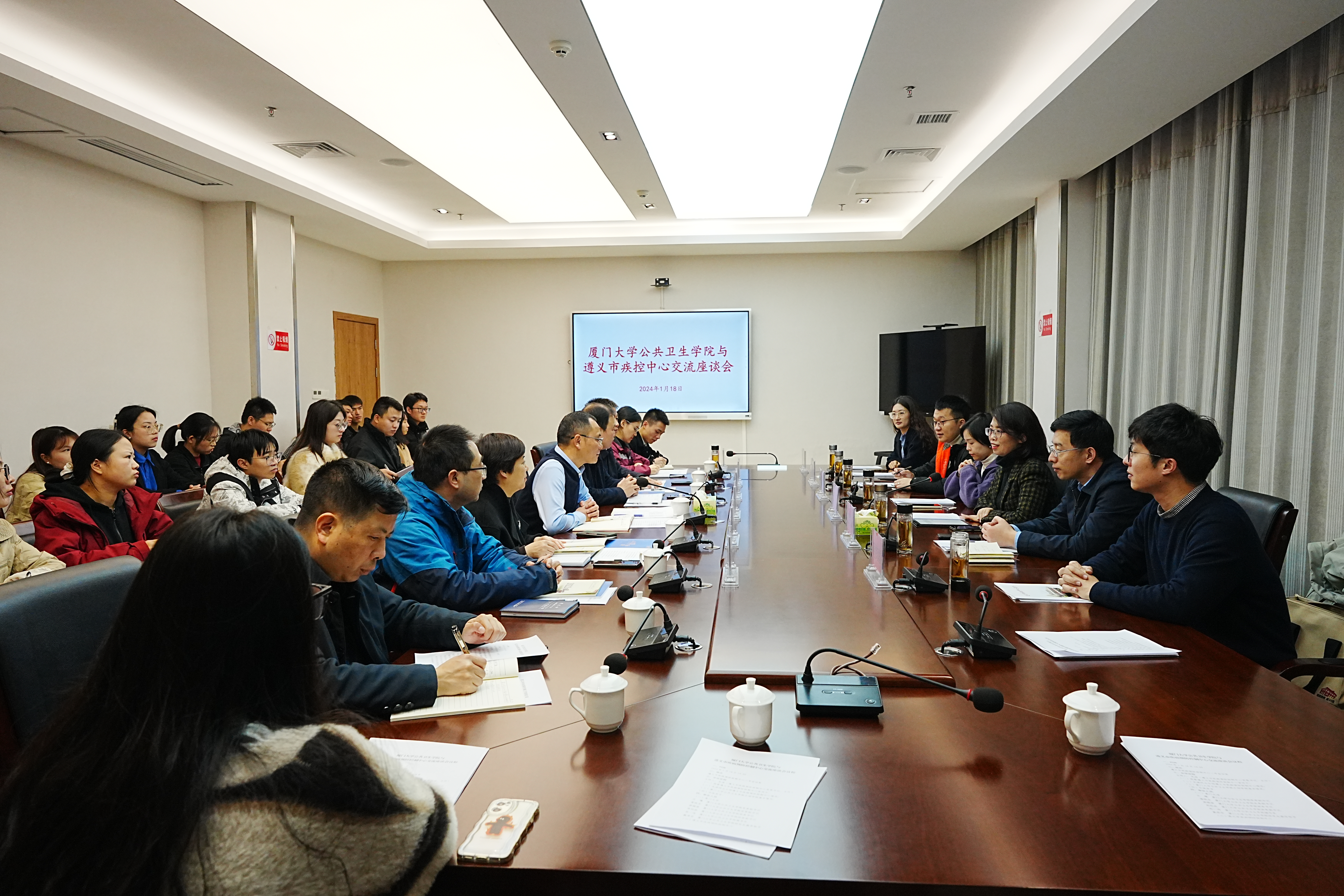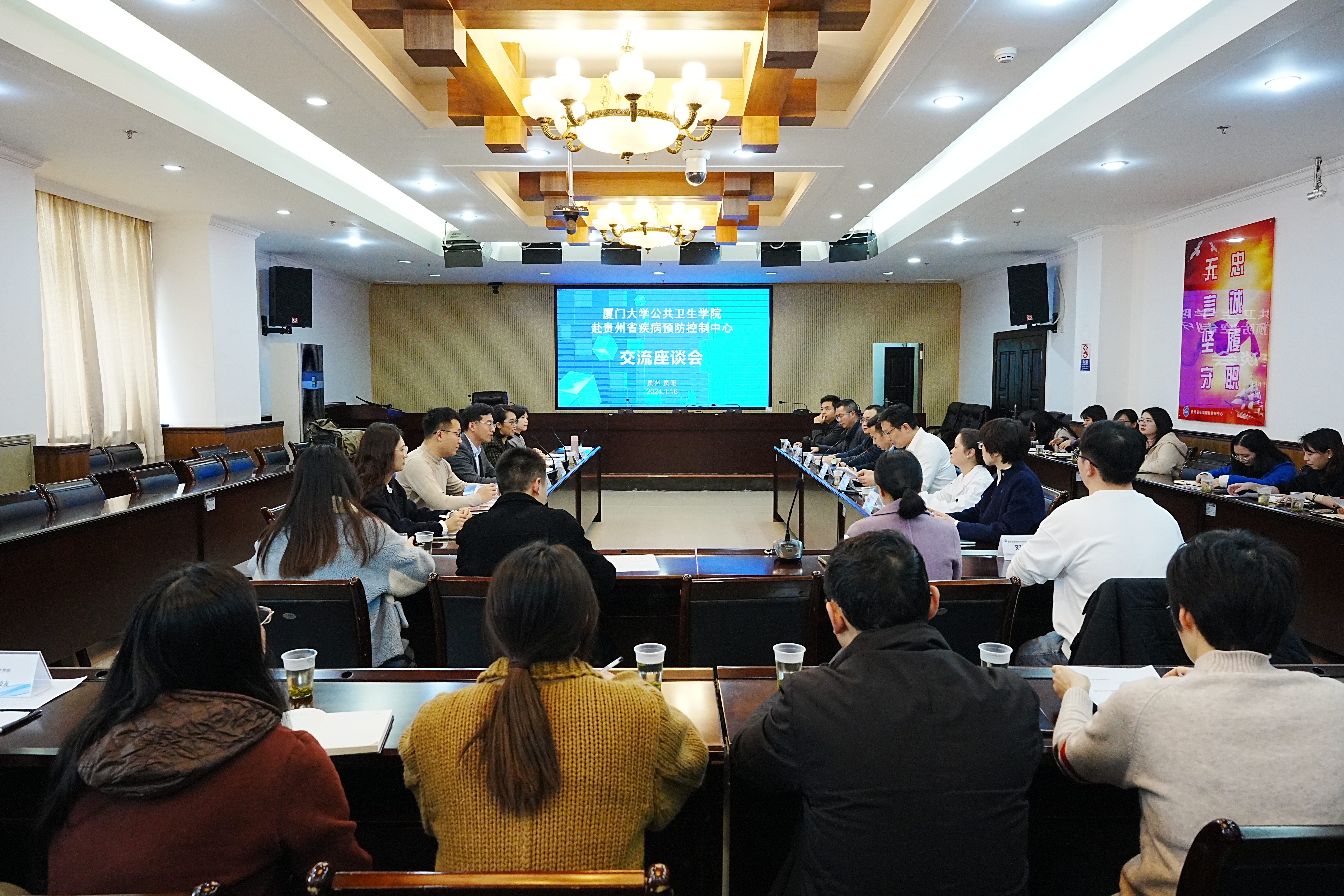 随后,双方进行了深入的座谈交流。李世军就贵州省疾控中心在科研创新、人才培训、业务工作开展等方面情况作了简要介绍。庄曦和蒲晓业对贵州省疾控中心的热情接待表示感谢,并从学院办学历史、人才培养情况、科研平台籍成果、目前研究领域等方面介绍了厦门大学公共卫生学院的基本情况。双方就科研合作、人才培养、就业实践等各方面开展深入合作交换了意见。