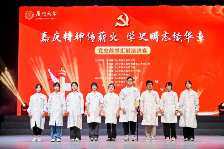 我院队伍主要通过“为民立命”“以身试药”“糖丸问世”三个部分进行展演,用真挚的情感、动人的表演,充分展现了顾方舟当年研发脊髓灰质炎疫苗的不易,体现了顾方舟百折不挠的科研精神和不畏牺牲、胸怀人民的大无畏精神。最后,所有表演人员回到舞台,共同表示:“厦大人将‘自强不息,止于至善’的校训内化于心,谱写一个又一个科技强国的奋斗篇章。作为公卫学子,我们将肩负起时代赋予的重任,努力实现高水平科技自立自强。”坚定表明作为公卫人的责任与为公卫事业奉献的决心。