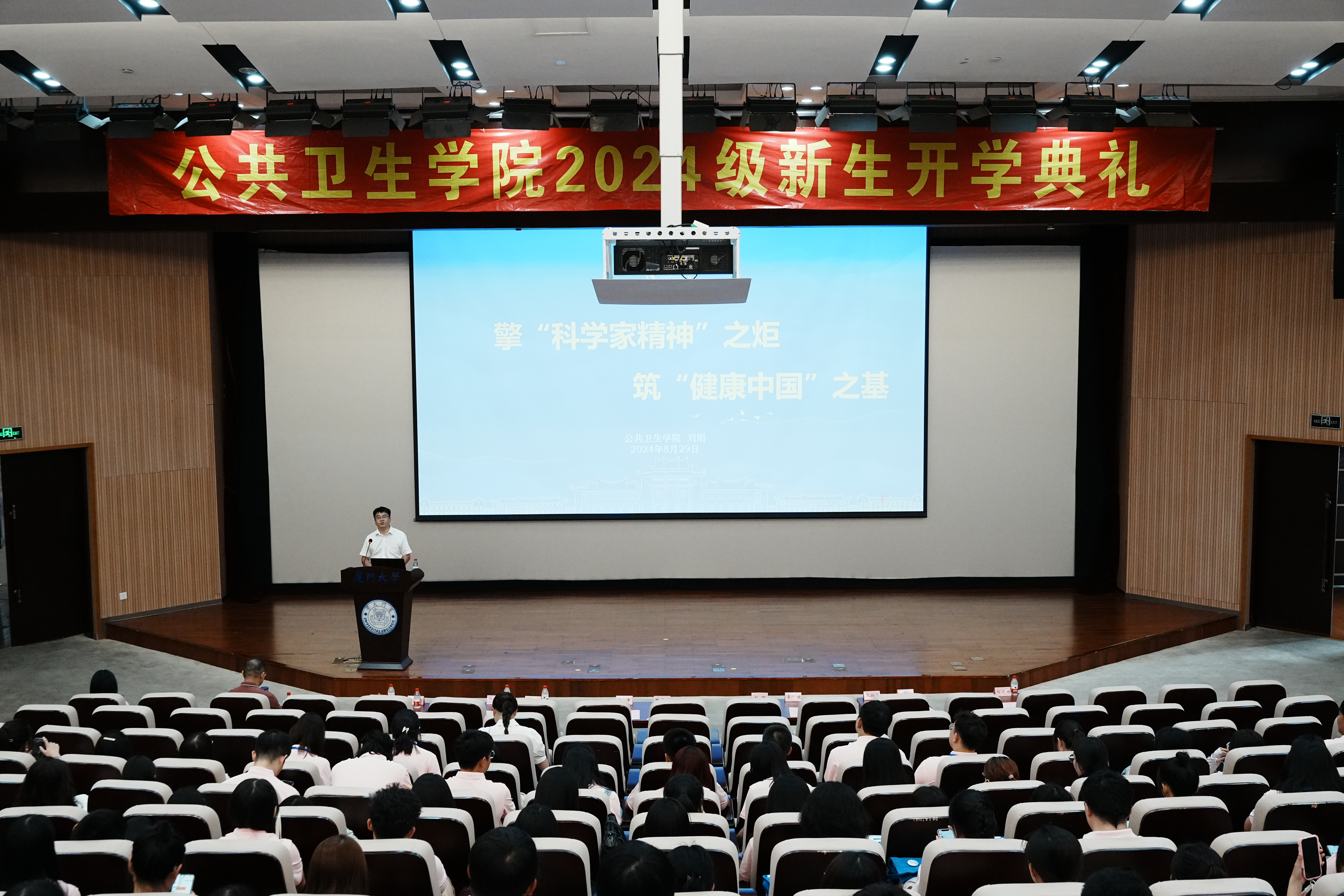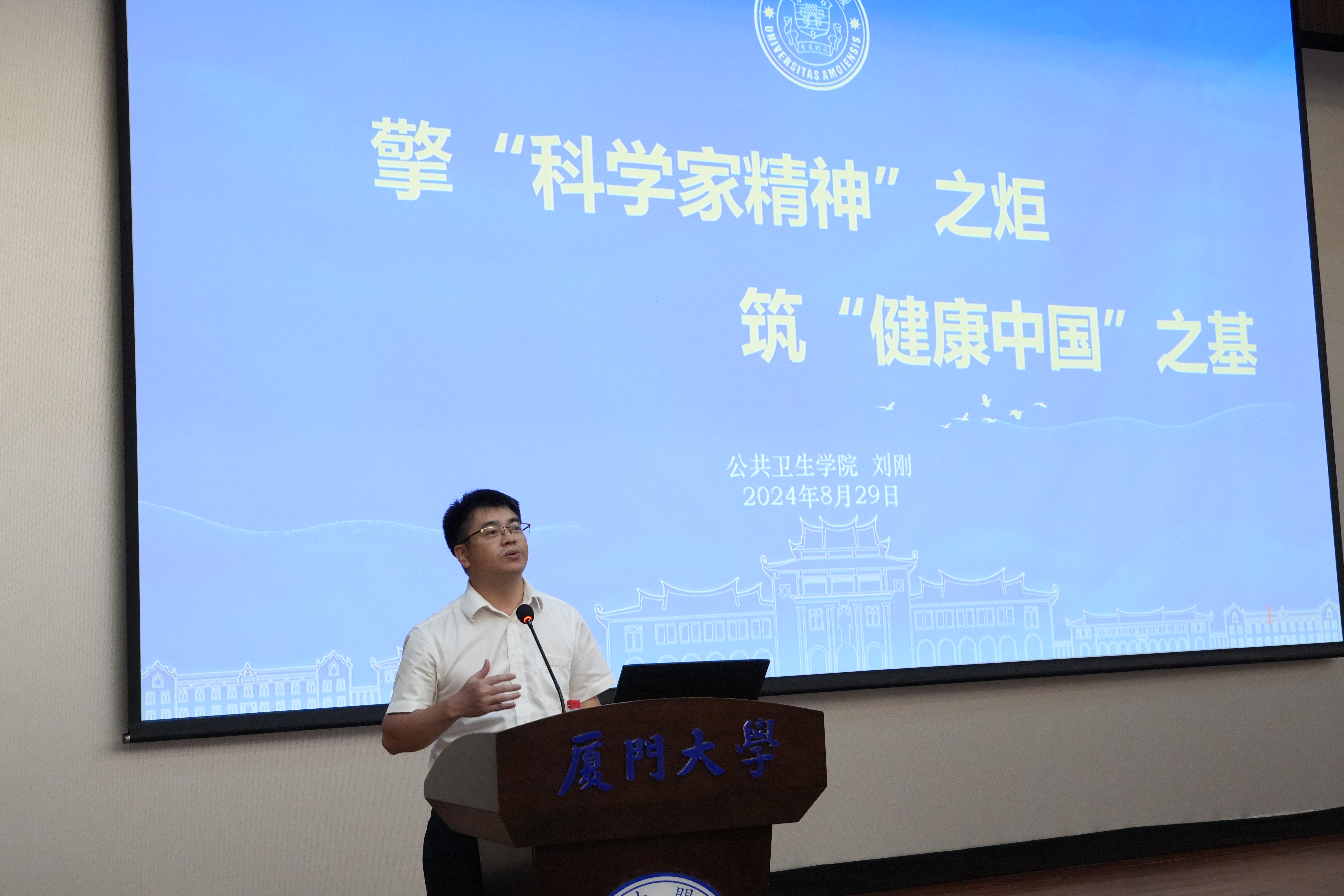 为弘扬科学家精神,激发科技创新热情,引导新生培养求真务实、严谨治学的科研态度,8月29日下午,在翔安校区德旺图书馆1号报告厅,厦门大学公共卫生学院副院长刘刚教授以《擎“科学家精神”之炬,筑“健康中国”之基》为题为新生们讲授了“开学第一课”。公共卫生学院全体2024级新生参与此次讲座,讲座由学院党委副书记刘君彬主持。