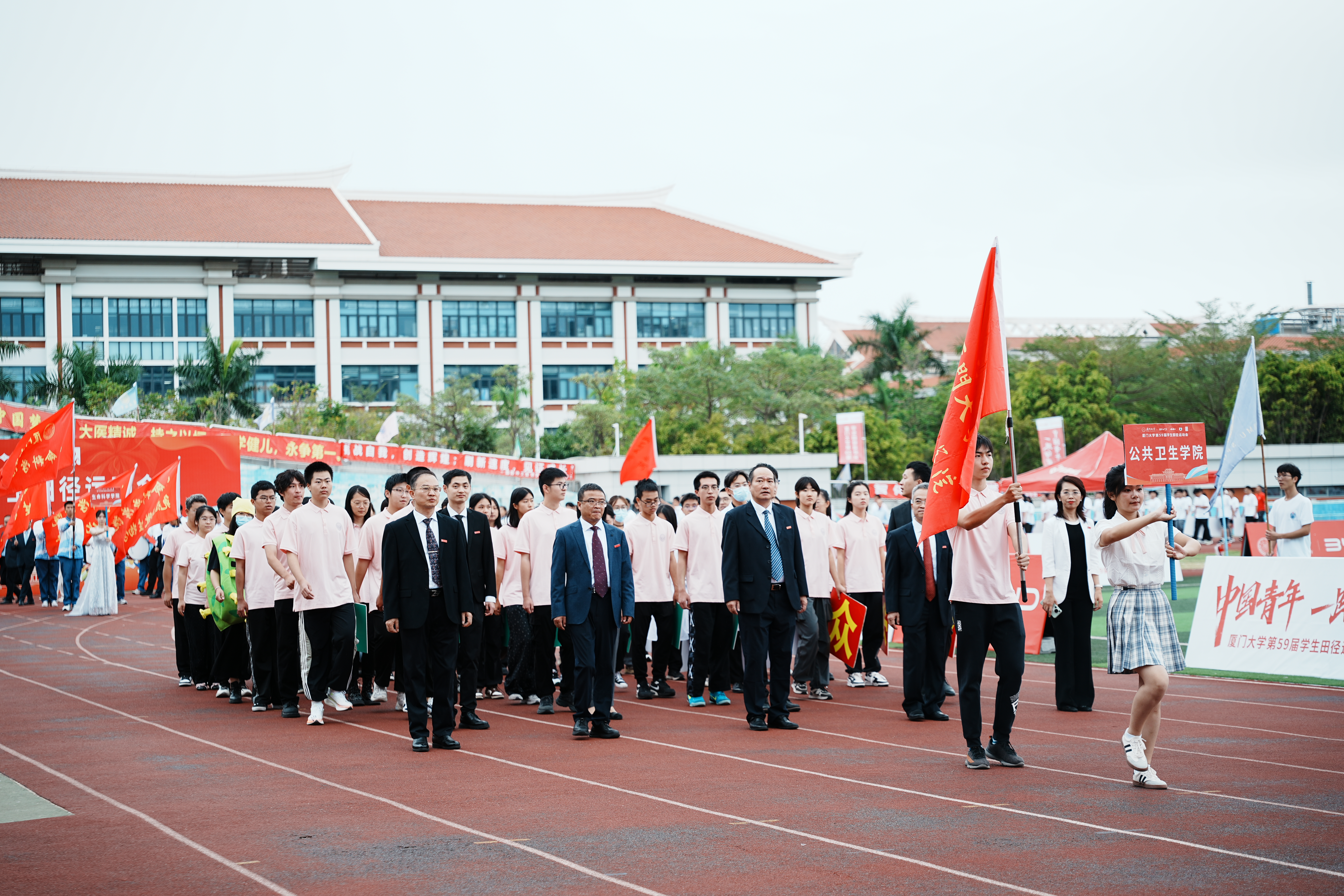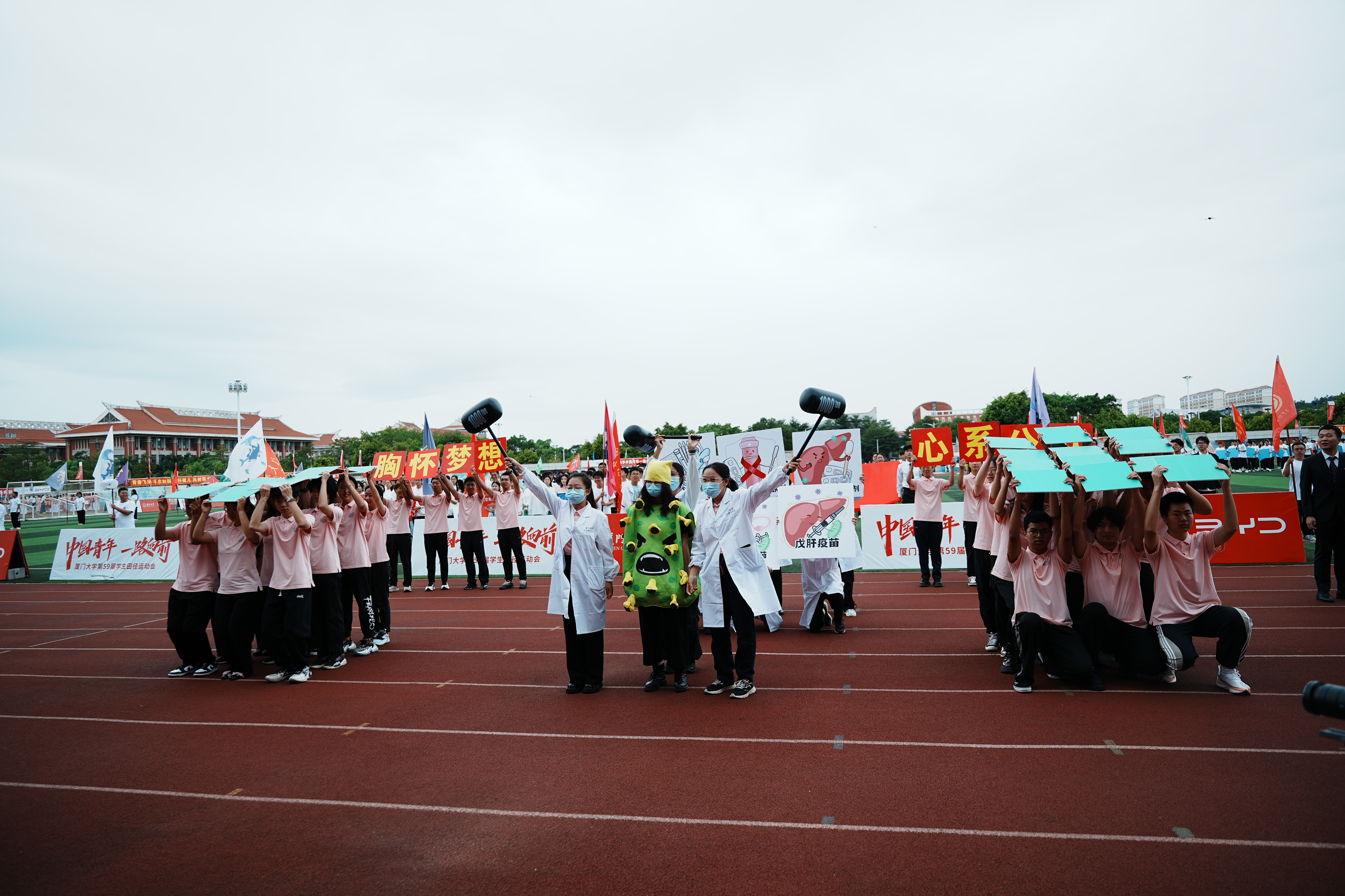 本次开幕式方阵由学院党委书记张琥,副院长林忠宁、葛胜祥,党委副书记庄曦、刘君彬,团委书记刘浥泓,团委副书记周钧庭,辅导员郑一鸣、陈煜铮以及2023级和2024级本科生组成。开幕式上,公共卫生学院的师生们迈着整齐划一的步伐,昂首阔步走向主席台前。他们以饱满的激情,展示公卫风貌,那富有学院特色的表演更是充满趣味,令人印象深刻。飒爽英姿,青春激昂,他们点燃现场气氛,尽显活力底色,既鼓舞着每一个人,也为即将上场的运动员健儿们加油打气。