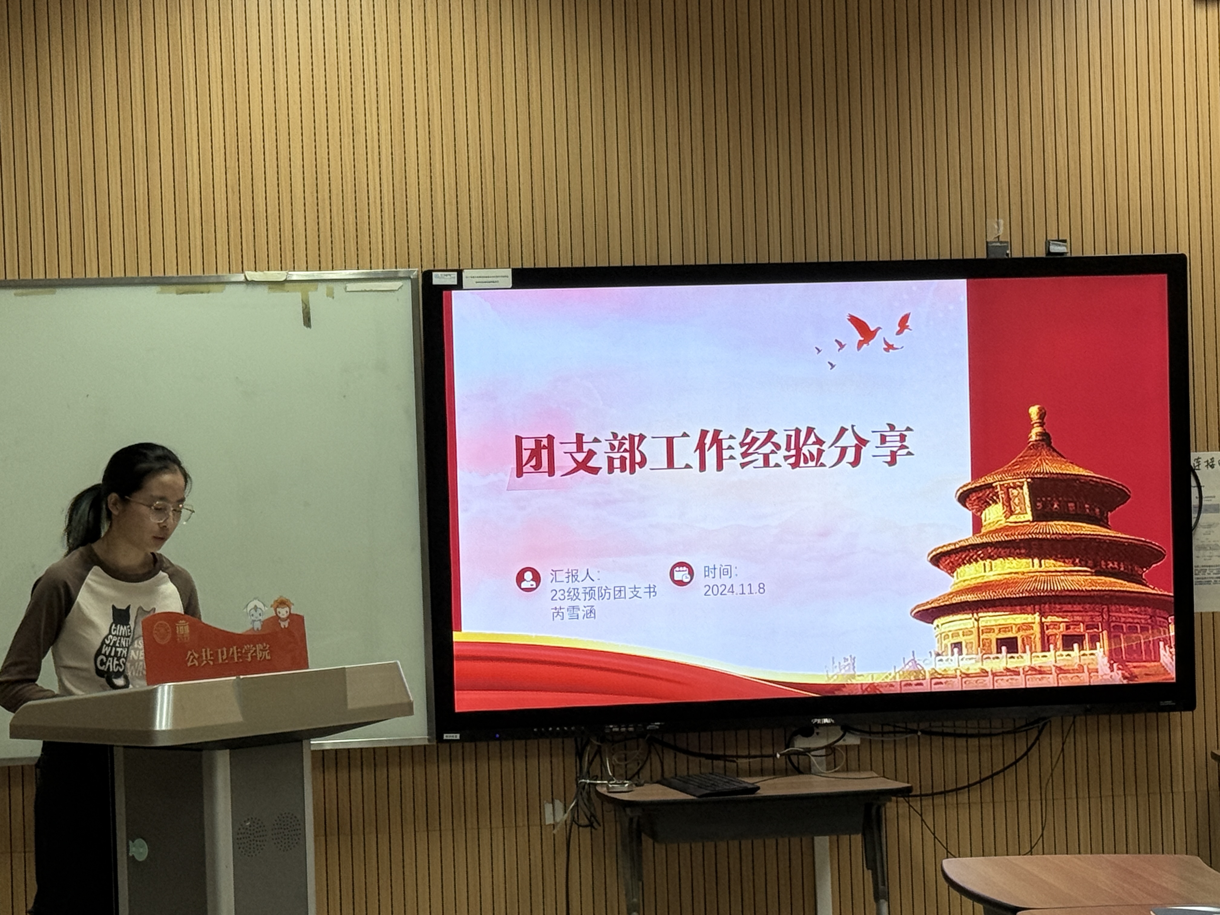 他山之石可以攻玉,为发挥优秀团支部的典型示范作用,加深各团支部书记对高水平公共卫生学院建设背景下如何建设优秀团支部这一问题的认识,本次培训活动特别邀请2023级预防班优秀团支部书记芮雪涵同学进行相关内容的分享。芮雪涵从团支部建设与管理、团支部活动组织与实施、智慧团建系统的操作与团支部的成长四个方面进行团务工作经验分享。其中,芮雪涵着重以一次专题理论学习为例从确定主题、明确分工与物资保障三个方面详细讲解如何开展团日活动。