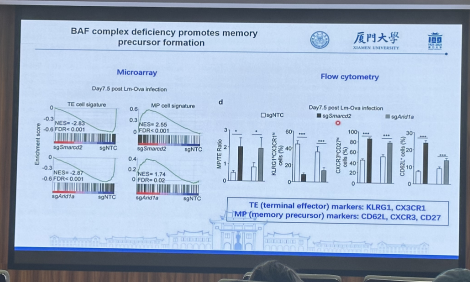 紧接着,黄宏龄以其在Nature上发表的科研成果Single-cell CRISPR screens in vivo map T cell fate regulomes in cancer和cBAF complex components and MYC cooperate early in CD8+ T cell fate为例,向大家分享肿瘤免疫领域的功能基因组研究。他指出,通过调节IKAROS、ETS1和RBPJ-IRF1轴,可以促进Tpex细胞退出静止状态并增强Tex细胞的增殖状态,从而提高抗肿瘤免疫和免疫疗法的效果。研究揭示了促进Tpex细胞从静止状态退出和丰富增殖性Tex细胞状态作为抗肿瘤效应的关键方式,提供了一个系统框架来整合细胞命运调控组和癌症免疫中可重编程的功能决定因素。黄宏龄详细解读了研究成果,展示了他对免疫细胞分类与功能的最新理解,并强调了基因组学技术,尤其是单细胞基因组学如何揭示免疫细胞的工作机制和调控网络。这些研究为肿瘤免疫治疗提供了新的理论基础和潜在的干预靶点。