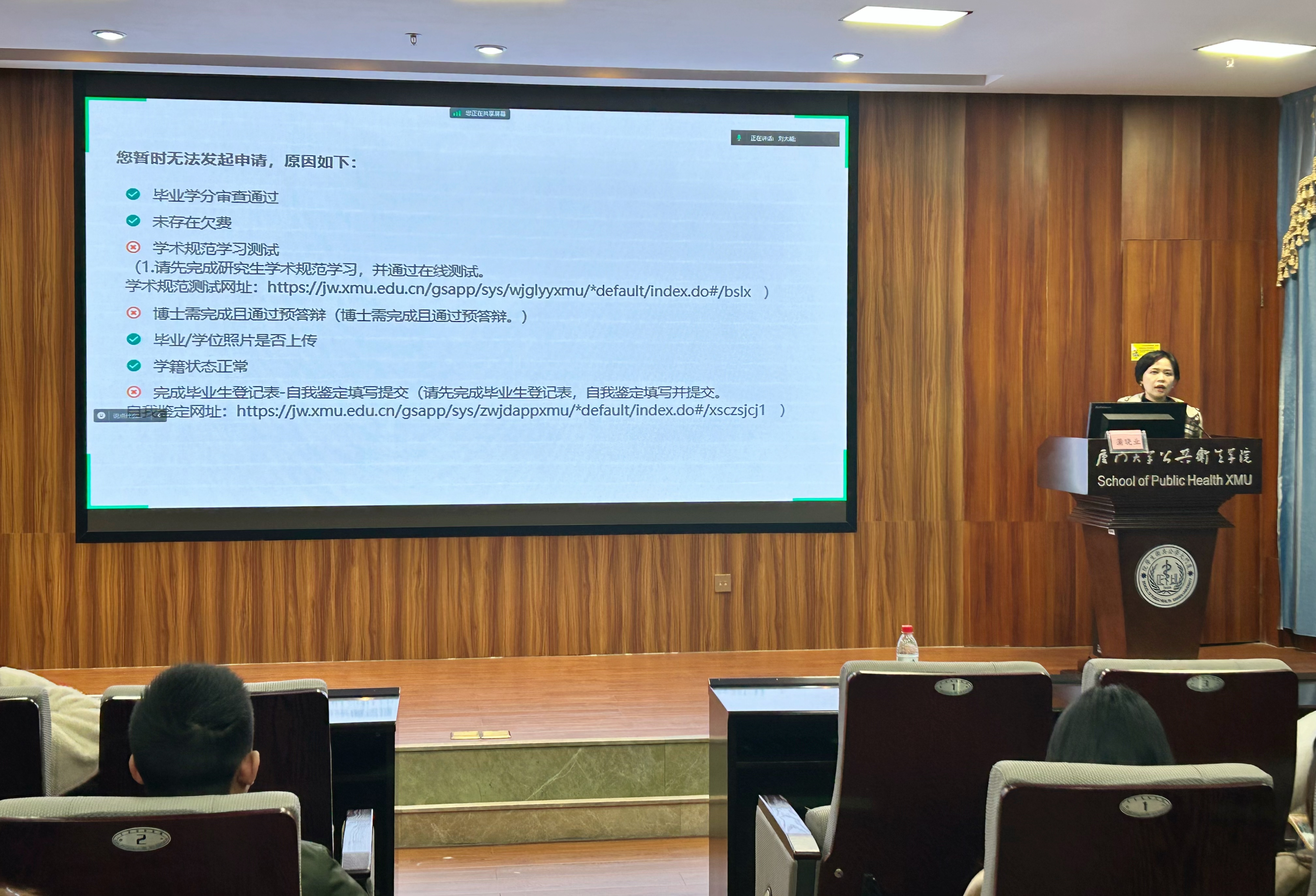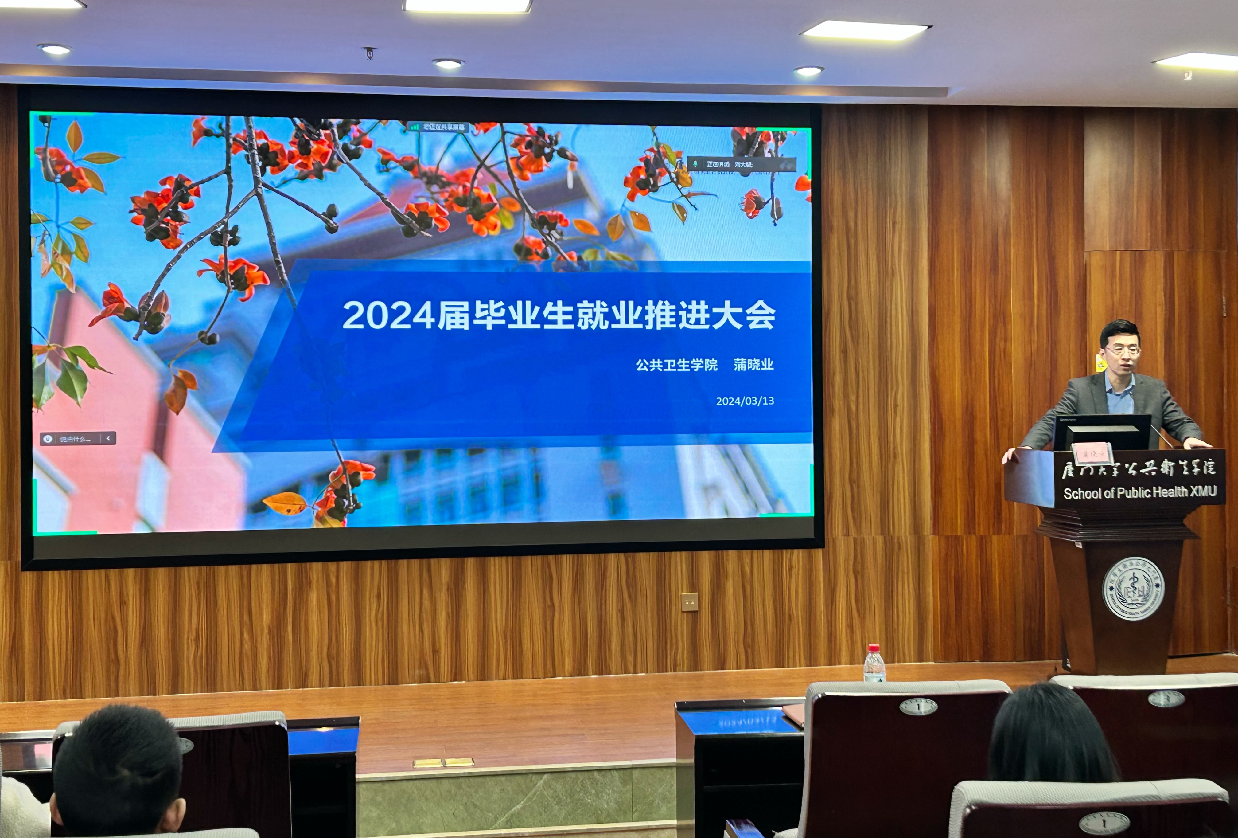 为进一步推进2024届研究生就业工作,2024年3月13日下午,厦门大学公共卫生学院在曾宪梓楼101会议室召开2024届研究生毕业生就业推进大会。学院党委副书记蒲晓业、团委书记游璐茜及研究生秘书戴秀芬参加本次会议,192名2024届研究生毕业生通过线上线下相结合的方式参加此次大会。
