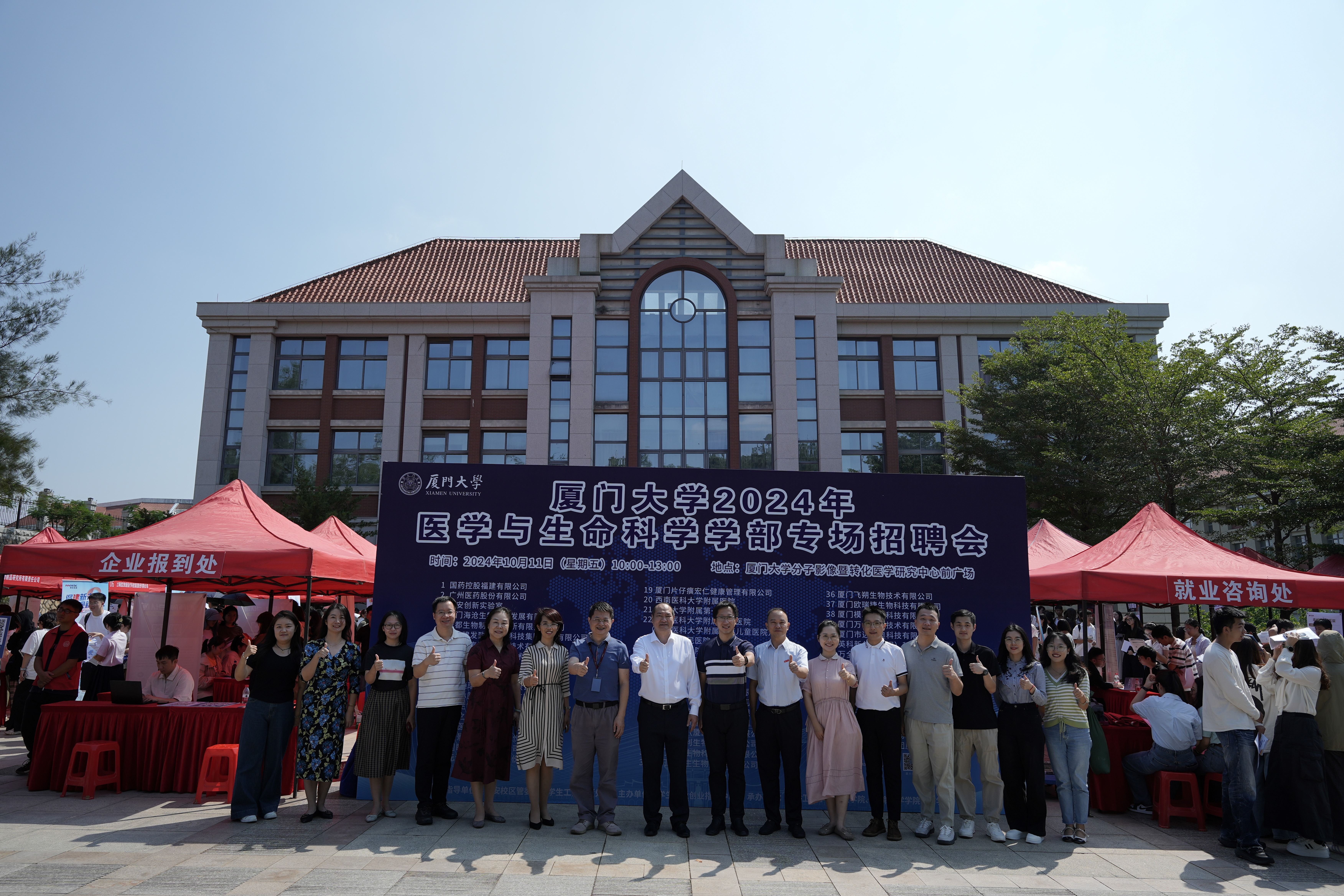 10月11日上午,厦门大学2024年医学与生命科学学部秋季专场招聘会于厦门大学翔安校区分子影像暨转化医学研究中心前广场举办,国药控股福建有限公司、广州医药股份有限公司、成都生物制品研究所有限责任公司、江苏恒瑞医药股份有限公司等51家用人单位参会。本次招聘会是在翔安校区管委会、厦门大学学生工作部(处)指导下,由厦门大学学生就业创业指导中心主办,公共卫生学院、医学院、生命科学学院与药学院共同承办。