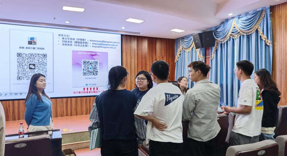 在活动中,江南大学无锡医学院护理学系主任蒋玉宇围绕学校概况、岗位需求、人才待遇等内容展开了介绍,让同学们直观了解到医院的用人需求。首先,蒋玉宇从江南大学的历史沿革讲起,详细介绍了学校完备的学科平台、蓬勃的发展态势以及优质的科研环境并表示江南大学正逐步成为“世界知名、中国一流、具有江南特色”的高水平研究型大学。