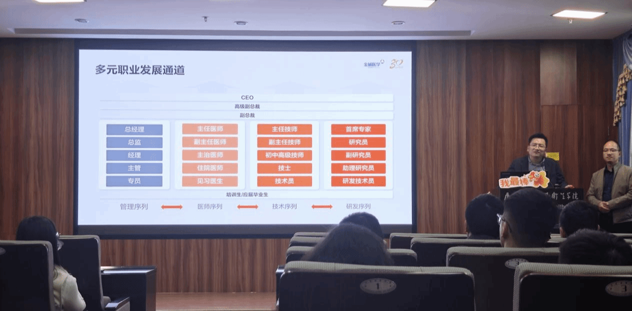 刘俊超介绍了金域医学的企业愿景、发展成就及人才培养体系。他表示,作为国内医学检验领域的领军企业之一,金域医学以“健康哨兵”为使命,致力为员工构建国际化发展平台。随后,他重点解读了“诊断支持代表”和“管培生”两大核心岗位的职业发展路径,详细介绍了企业的晋升机制等政策。